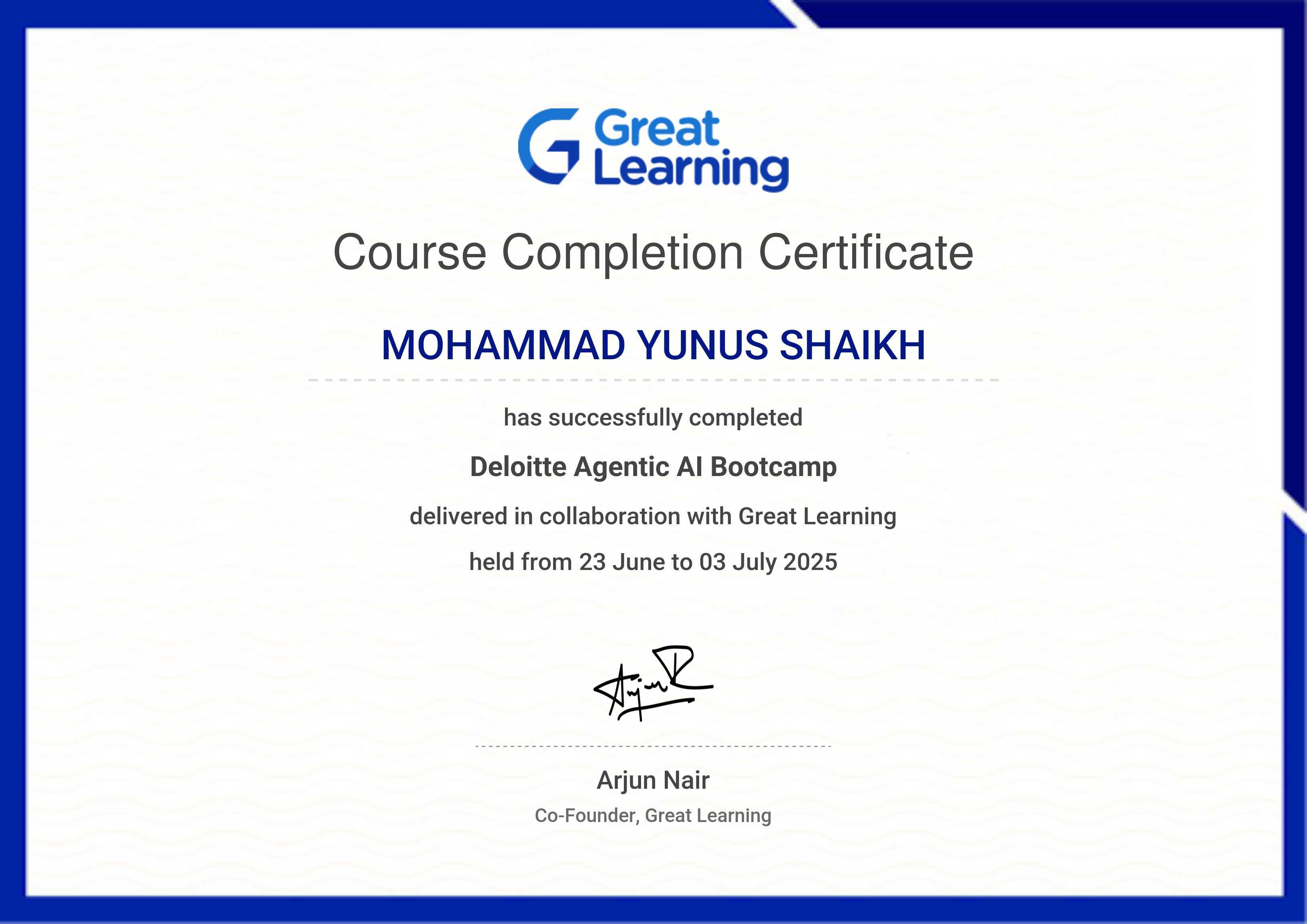 The certificate below verifies that MOHAMMAD YUNUS SHAIKH has completed the Deloitte Agentic AI Bootcamp