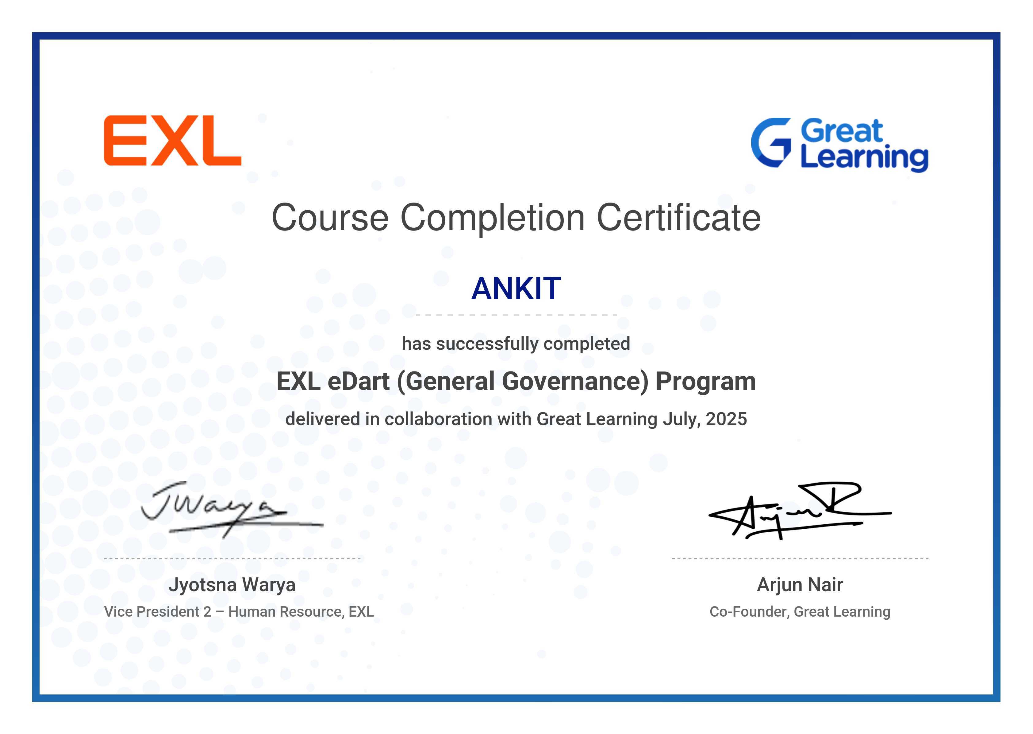 The certificate below verifies that ANKIT has completed the EXL - eDart (General Governance) Program