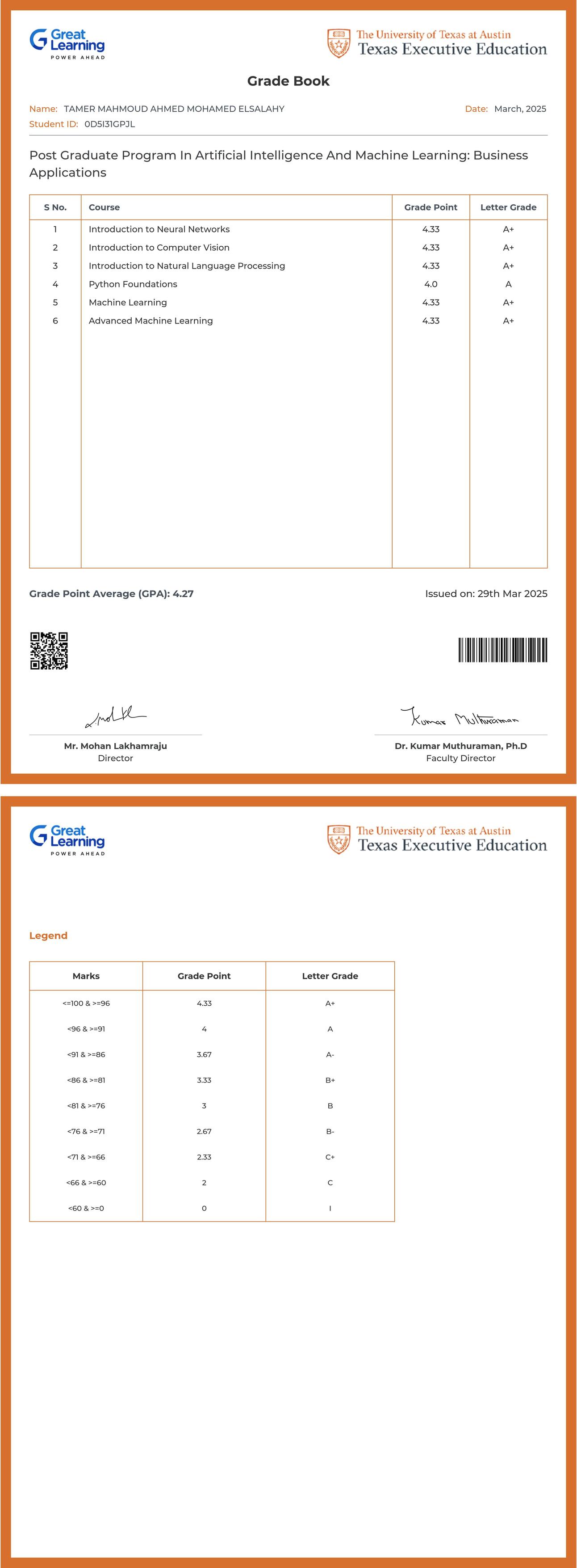 The grade sheet below verifies that TAMER MAHMOUD AHMED MOHAMED ELSALAHY has completed the POST GRADUATE PROGRAM IN ARTIFICIAL INTELLIGENCE AND MACHINE LEARNING: BUSINESS APPLICATIONS