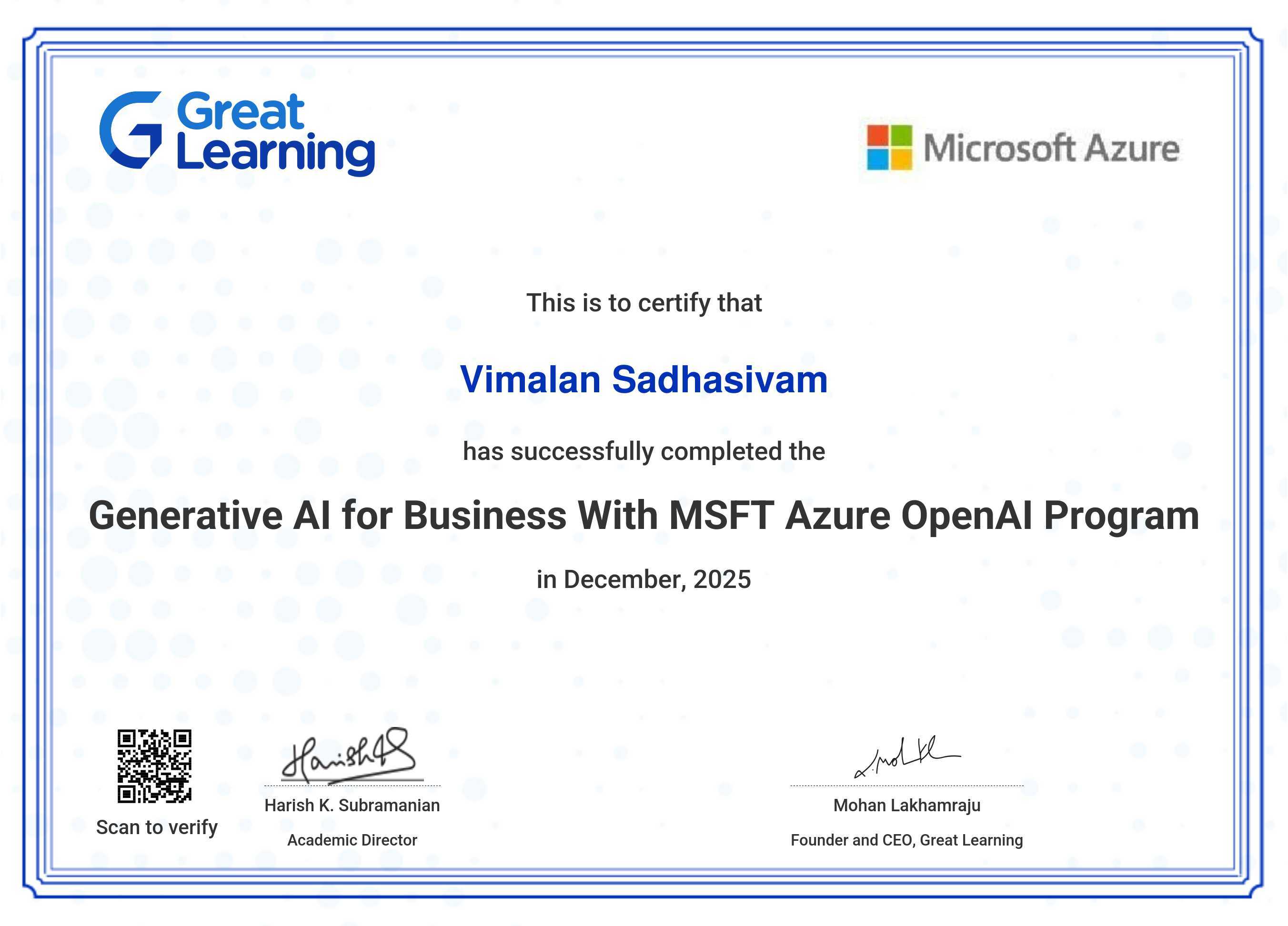 The certificate below verifies that VIMALAN SADHASIVAM has completed the GENERATIVE AI for BUSINESS WITH MSFT AZURE OpenAI PROGRAM