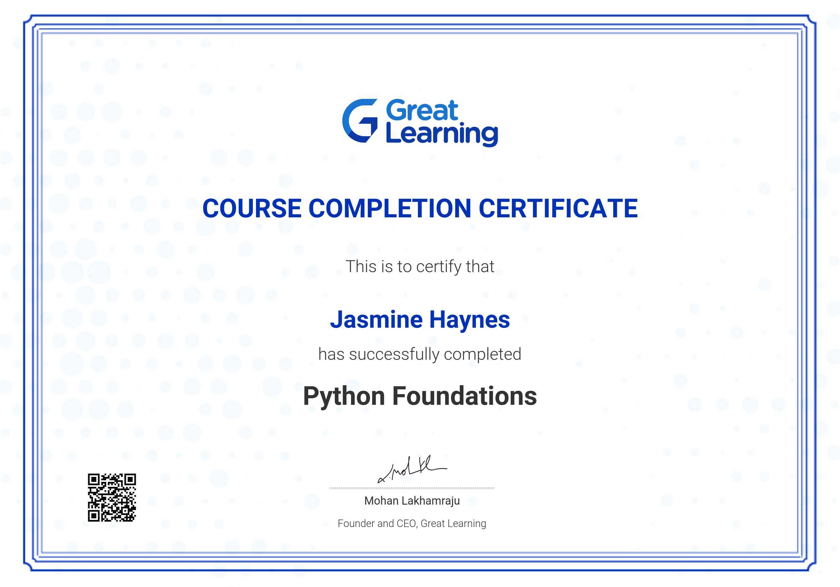 The certificate below verifies that Jasmine Haynes has completed the Python Foundations course