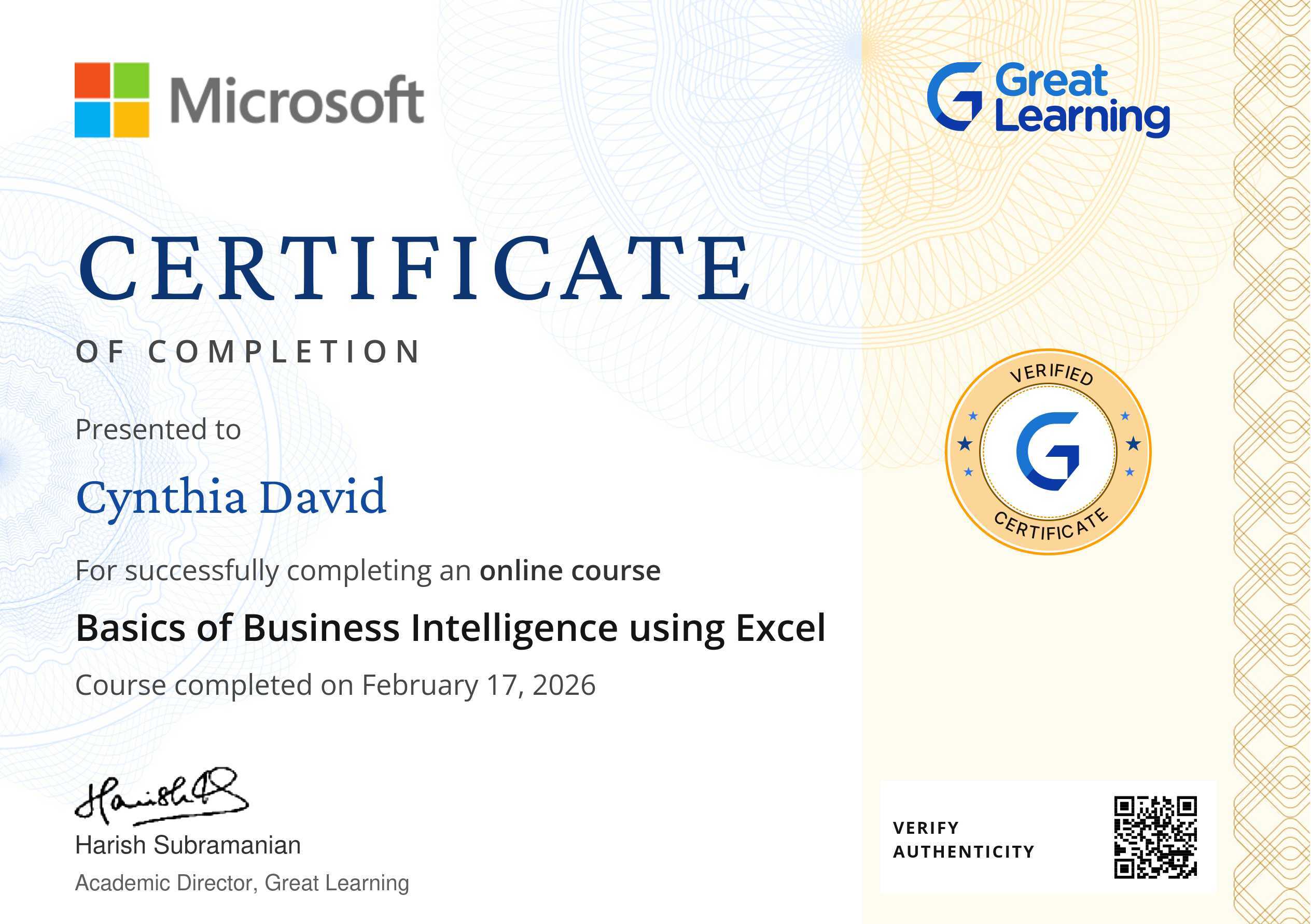 The certificate above verifies that Cynthia David has successfully completed the course Basics of Business Intelligence using Excel