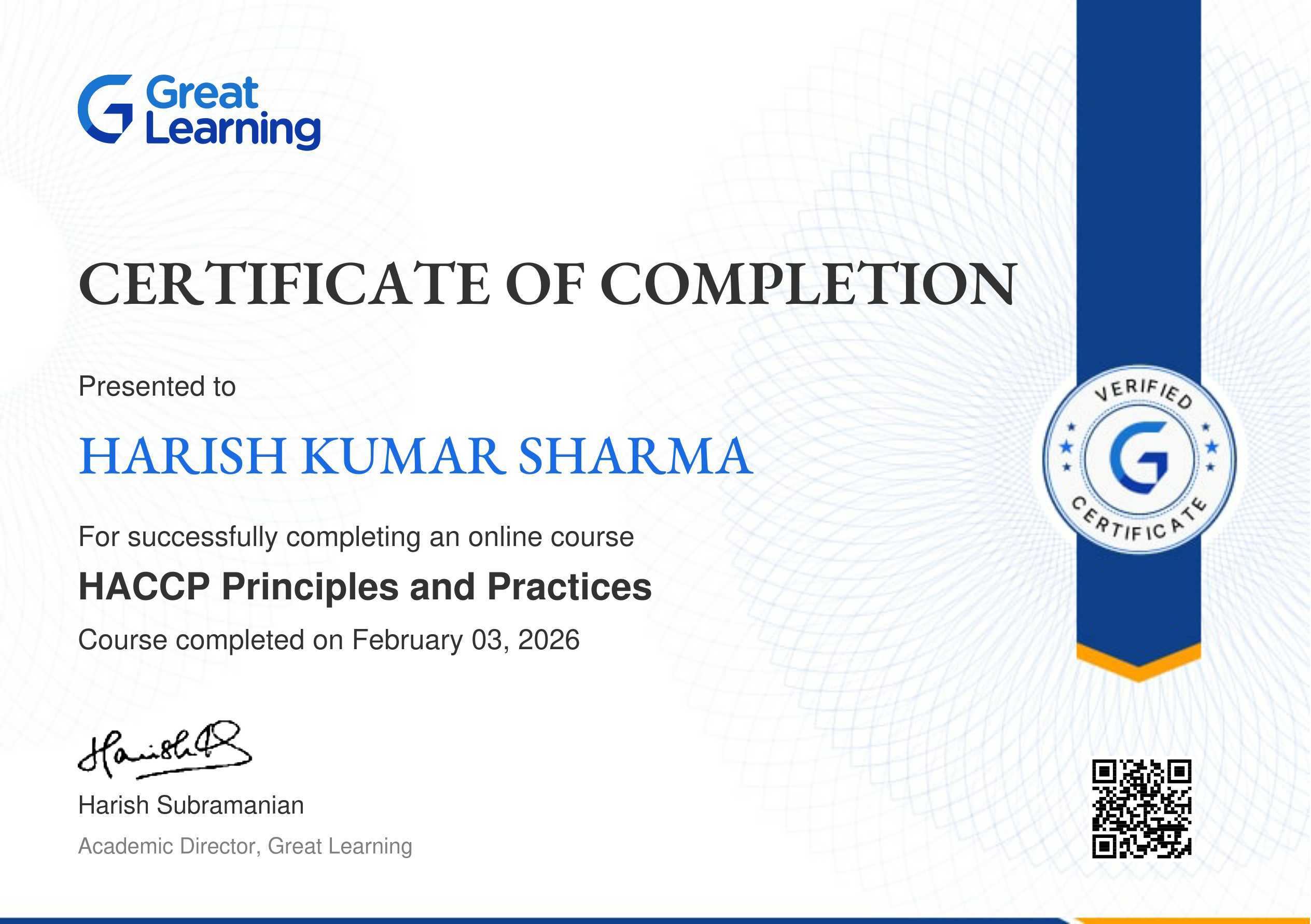 The certificate above verifies that Harish Kumar Sharma has successfully completed the course HACCP Principles and Practices