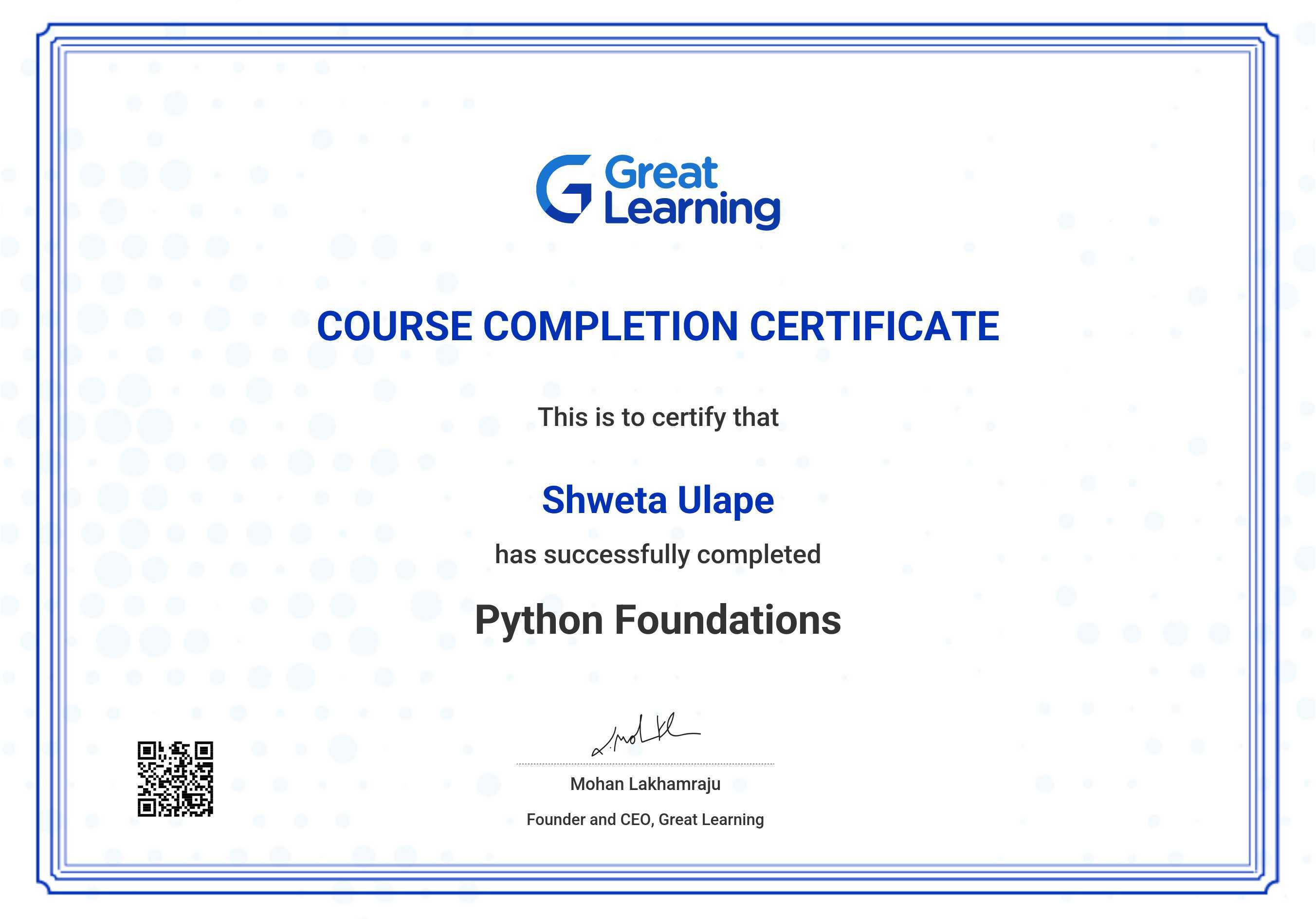 The certificate below verifies that Shweta Ulape has completed the Python Foundations course