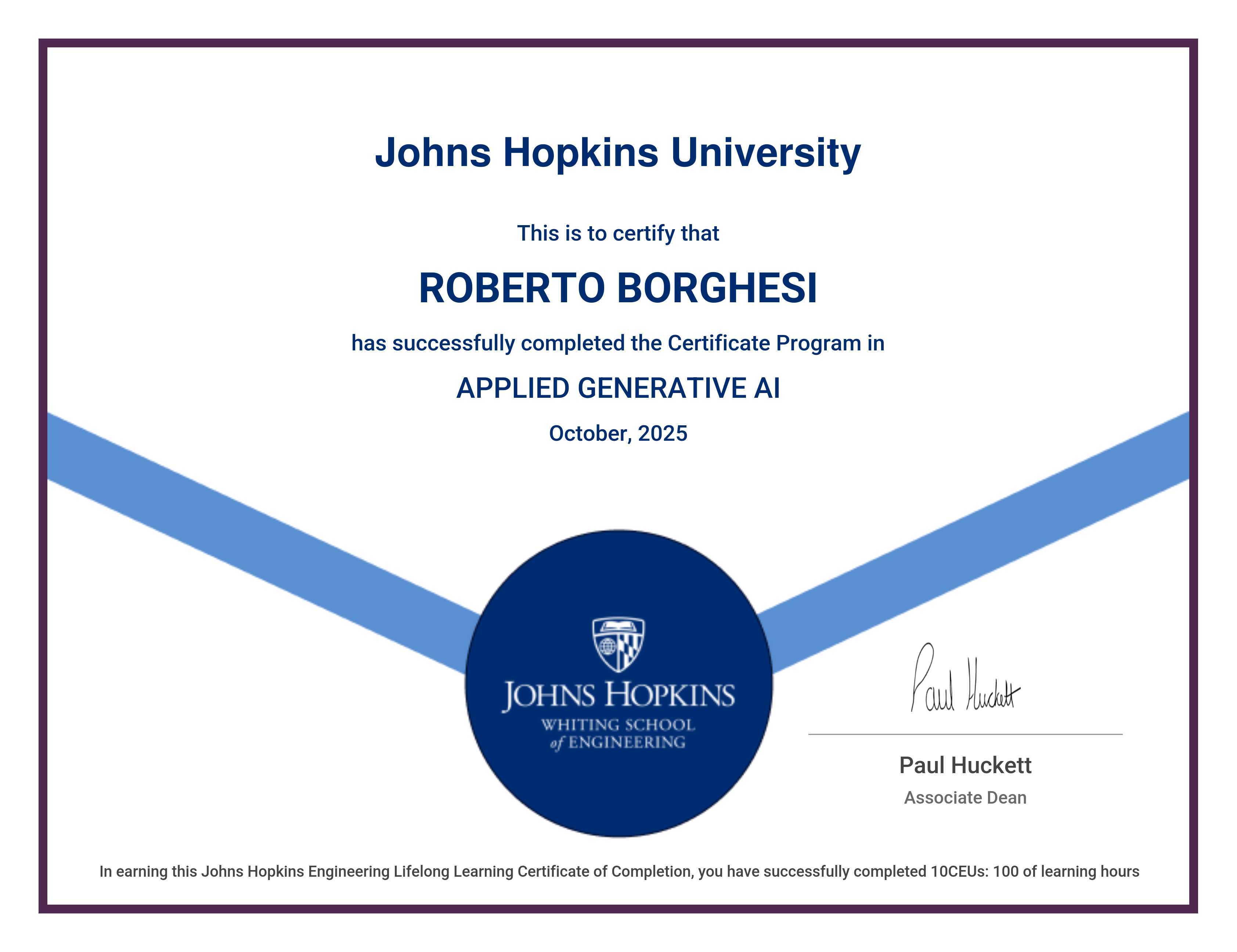 The certificate below verifies that ROBERTO BORGHESI has completed the APPLIED GENERATIVE AI