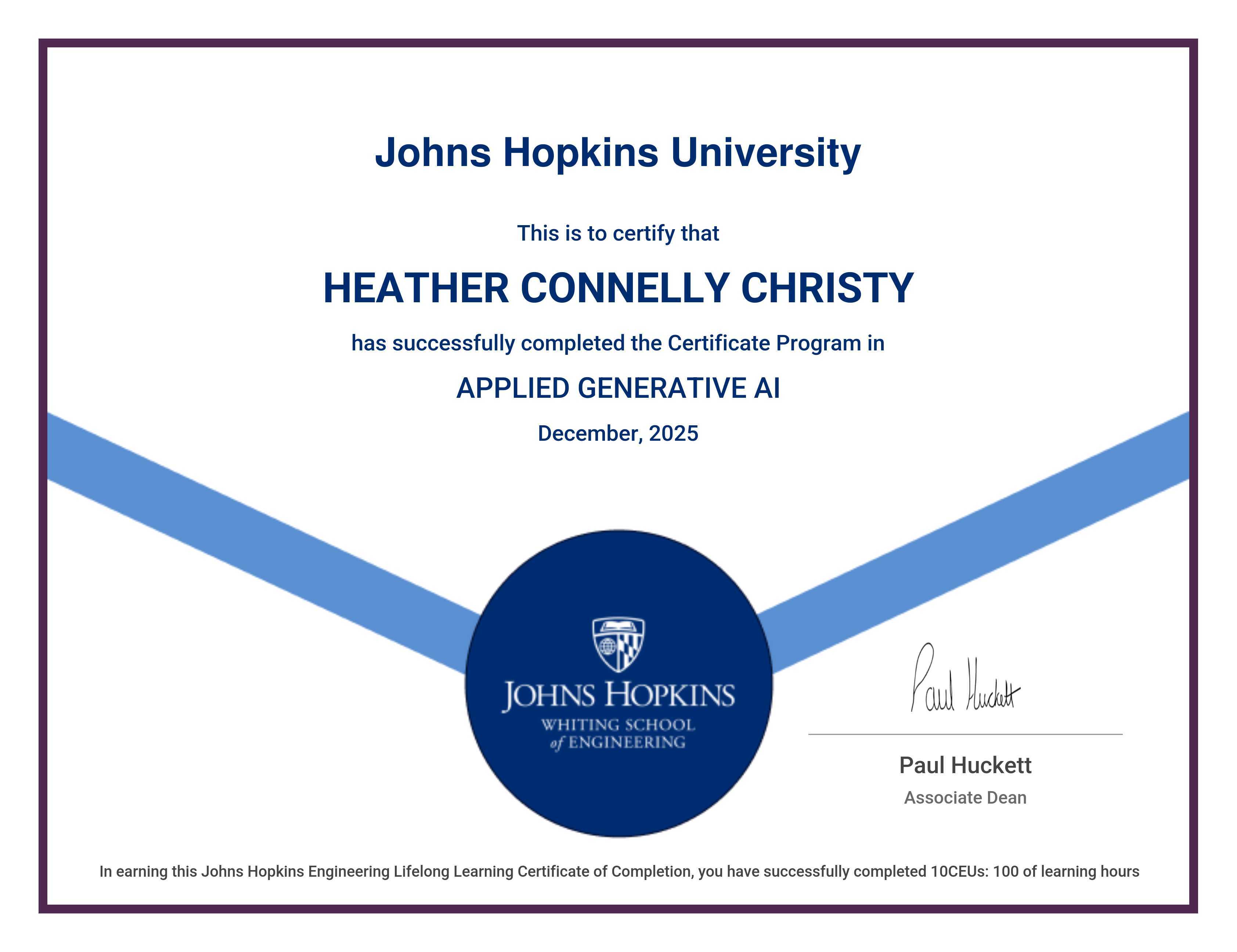 The certificate below verifies that HEATHER CONNELLY CHRISTY has completed the APPLIED GENERATIVE AI