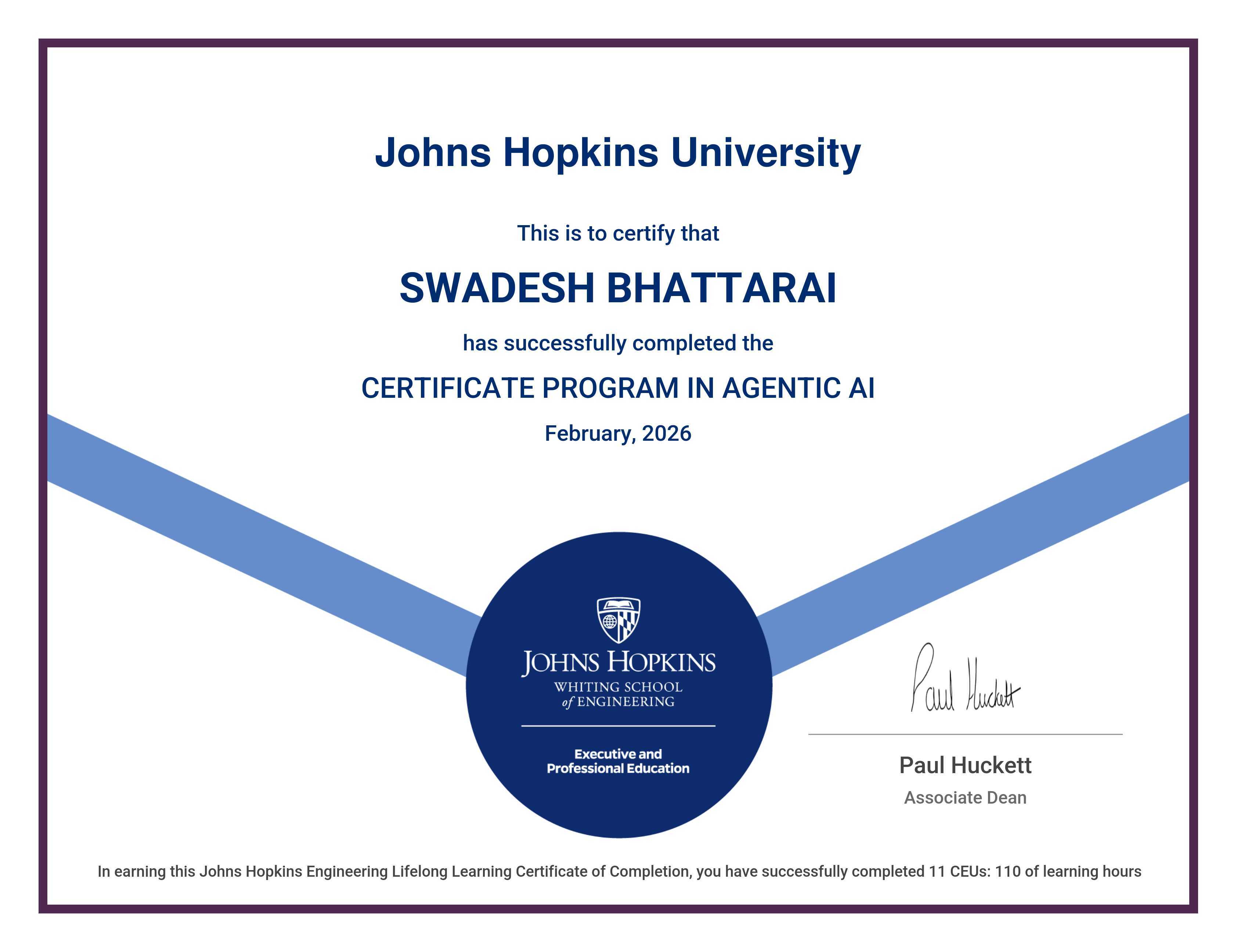 The certificate below verifies that SWADESH BHATTARAI has completed the CERTIFICATE PROGRAM IN AGENTIC AI
