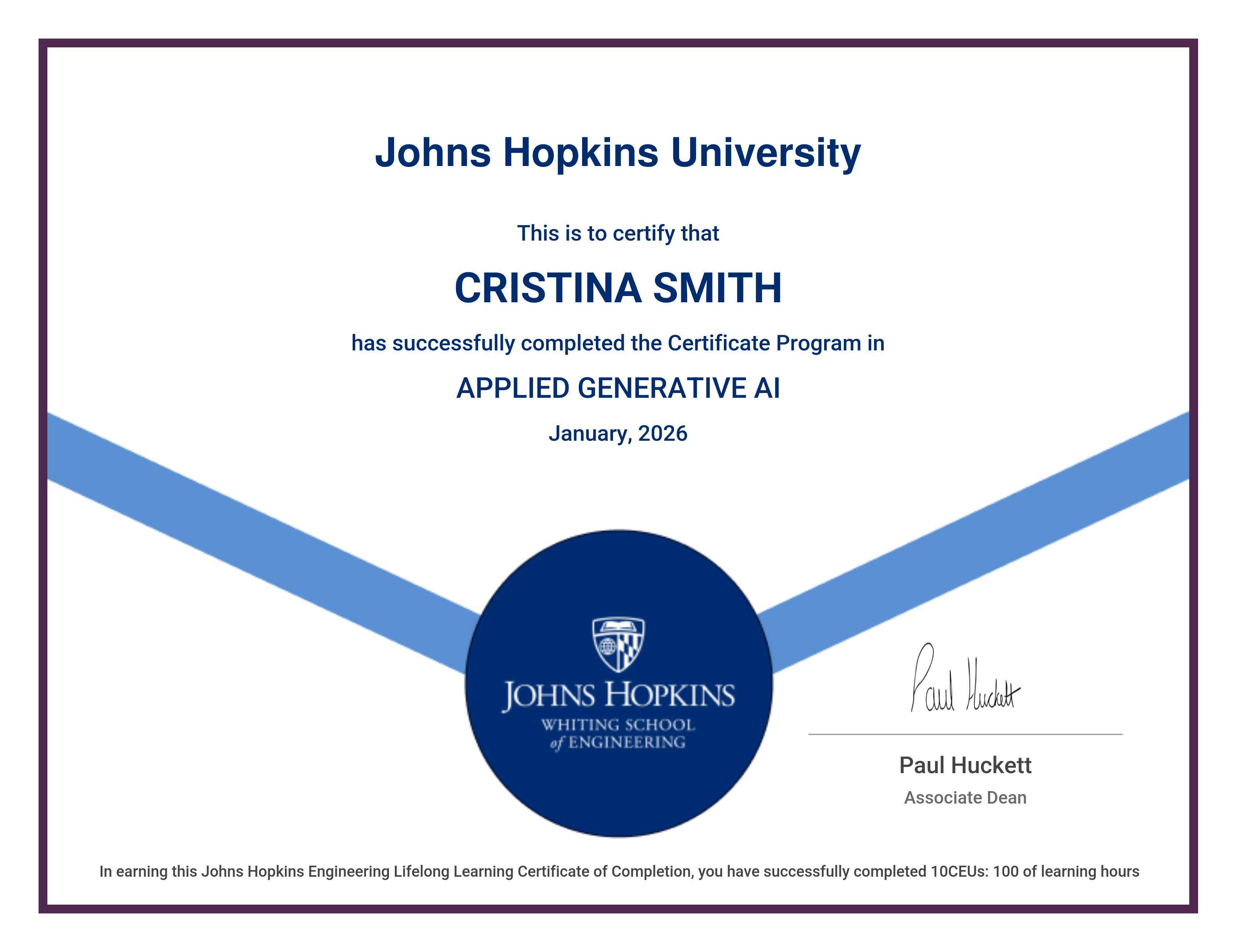 The certificate below verifies that CRISTINA SMITH has completed the APPLIED GENERATIVE AI