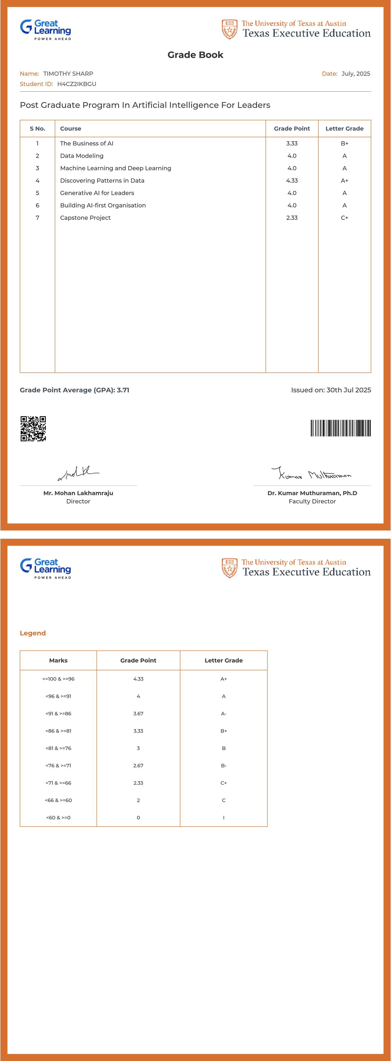 The grade sheet below verifies that TIMOTHY SHARP has completed the POST GRADUATE PROGRAM IN ARTIFICIAL INTELLIGENCE for LEADERS