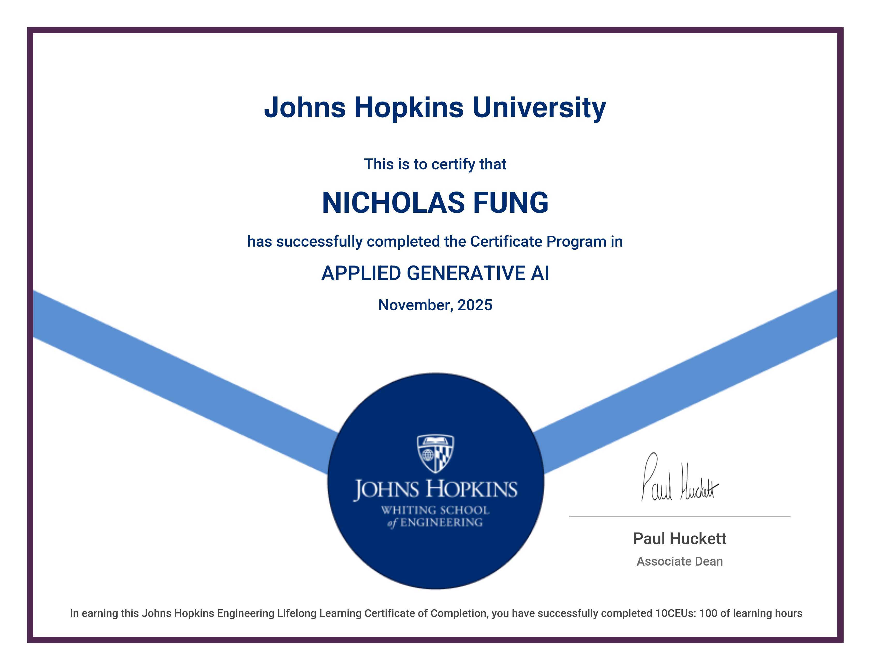 The certificate below verifies that NICHOLAS FUNG has completed the APPLIED GENERATIVE AI