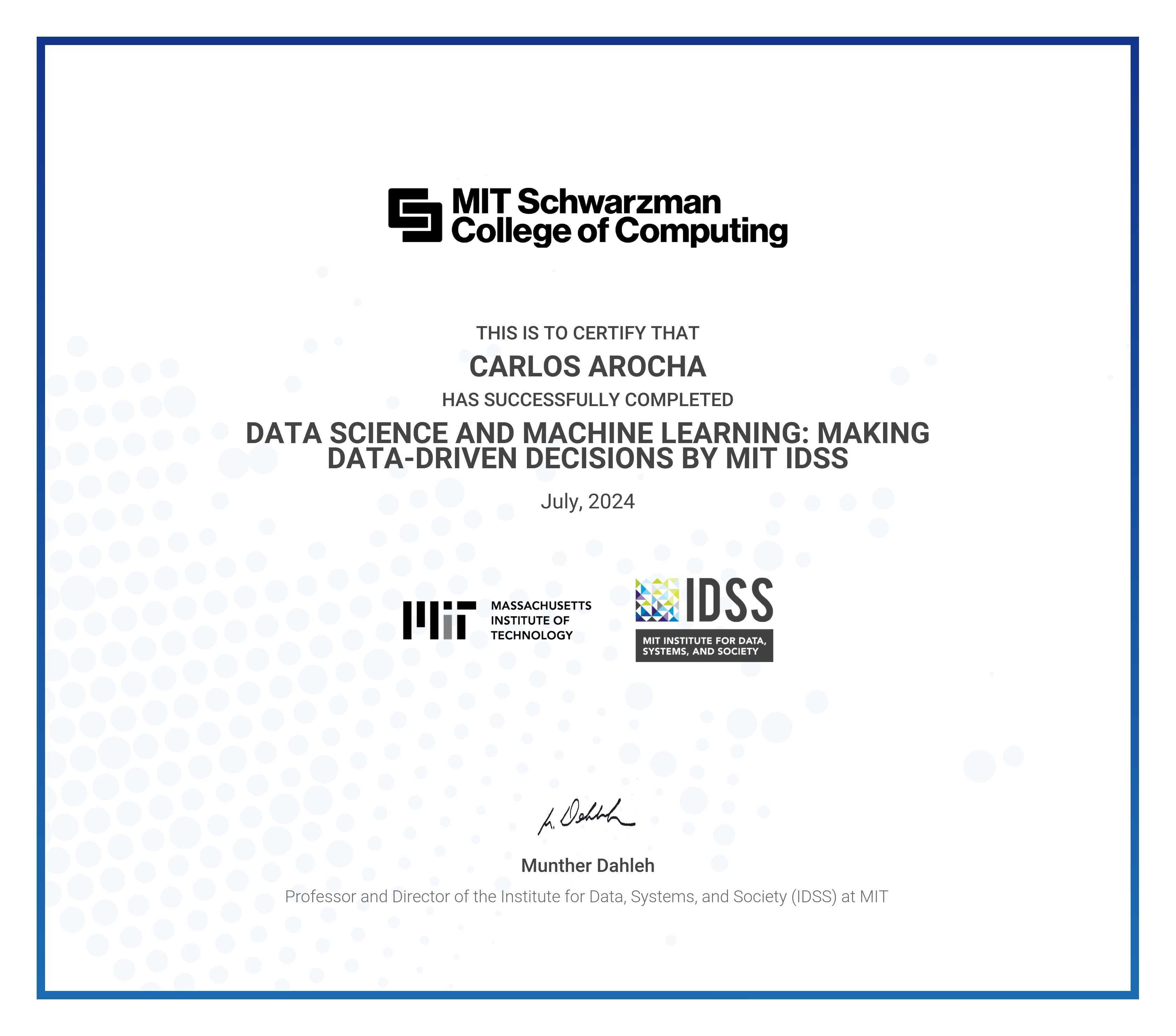 The certificate below verifies that CARLOS AROCHA has completed the DATA SCIENCE AND MACHINE LEARNING: MAKING DATA-DRIVEN DECISIONS BY MIT IDSS