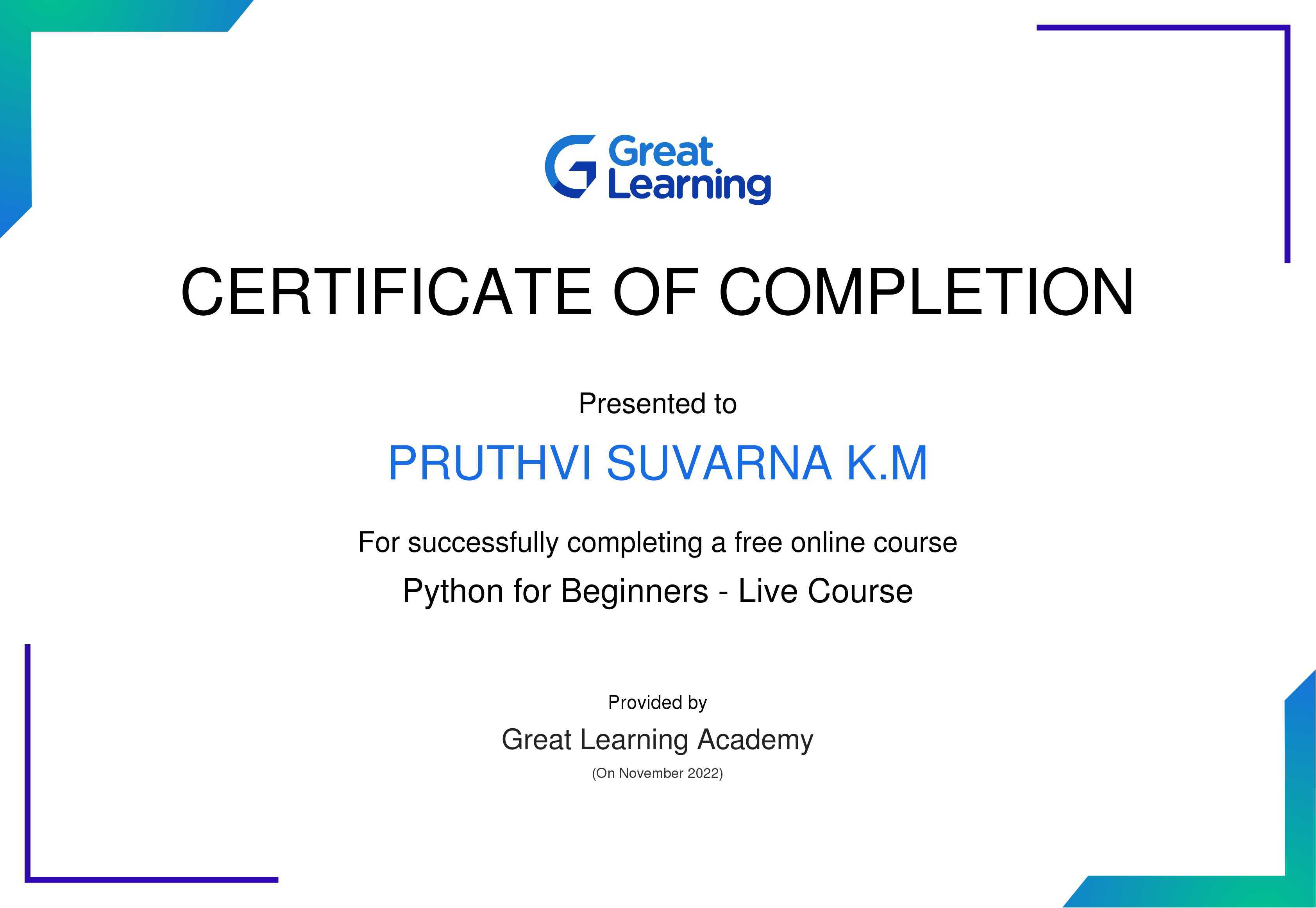 The certificate above verifies that Pruthvi Suvarna K.M has successfully completed the course Python for Beginners - Live Course