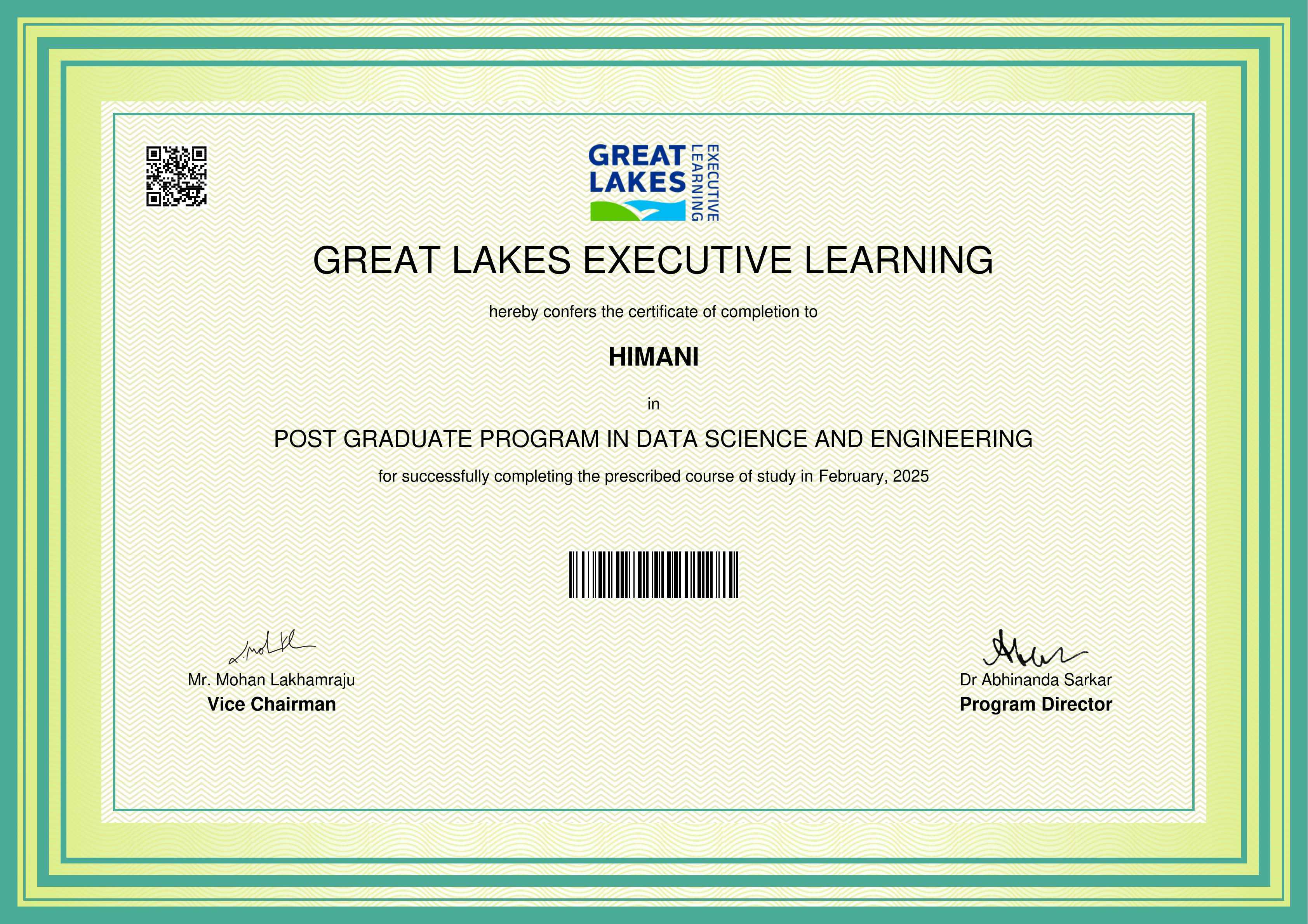 The certificate below verifies that HIMANI has completed the POST GRADUATE PROGRAM IN DATA SCIENCE AND ENGINEERING