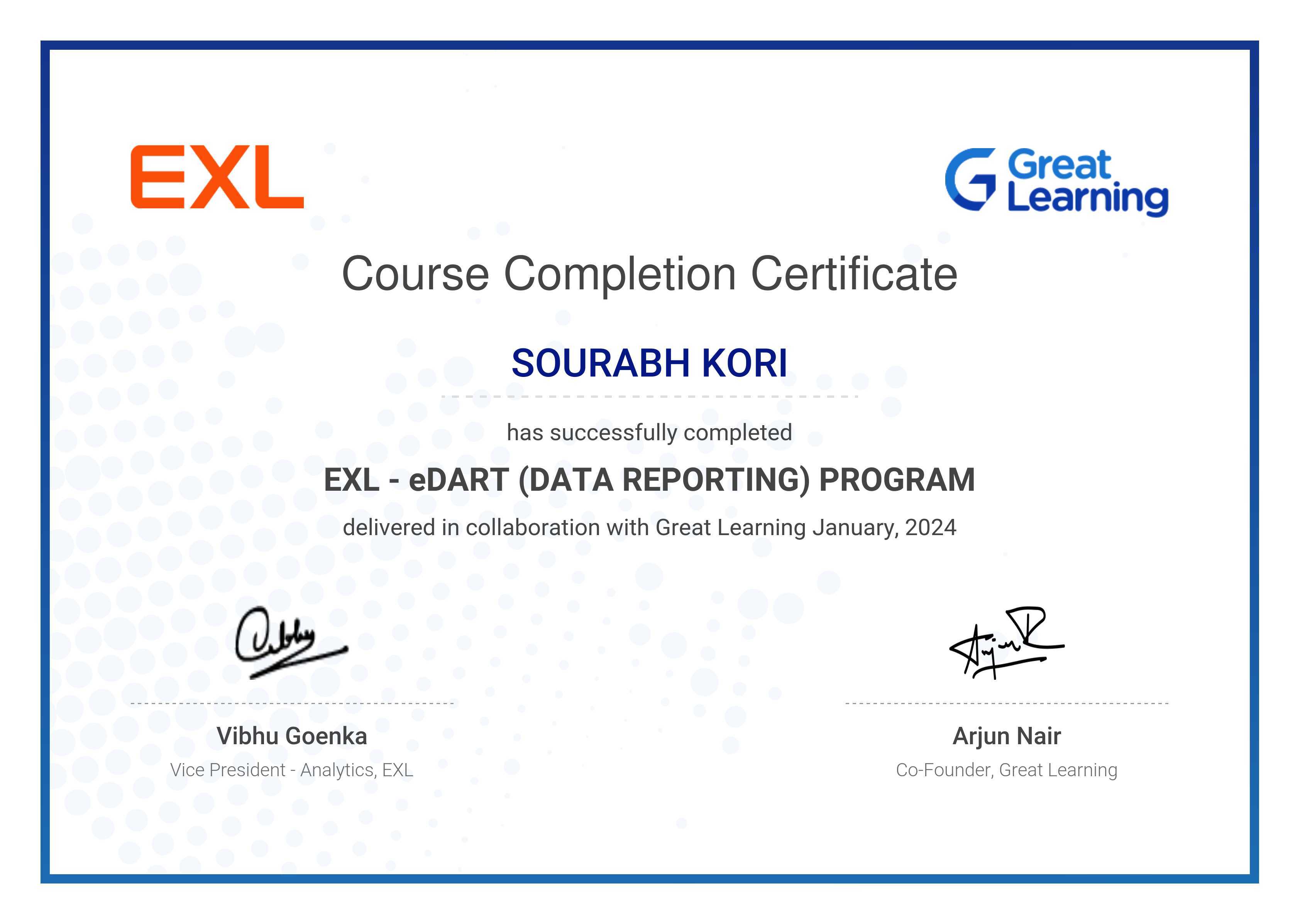 The certificate below verifies that SOURABH KORI has completed the EXL - eDART (Data Reporting) Program
