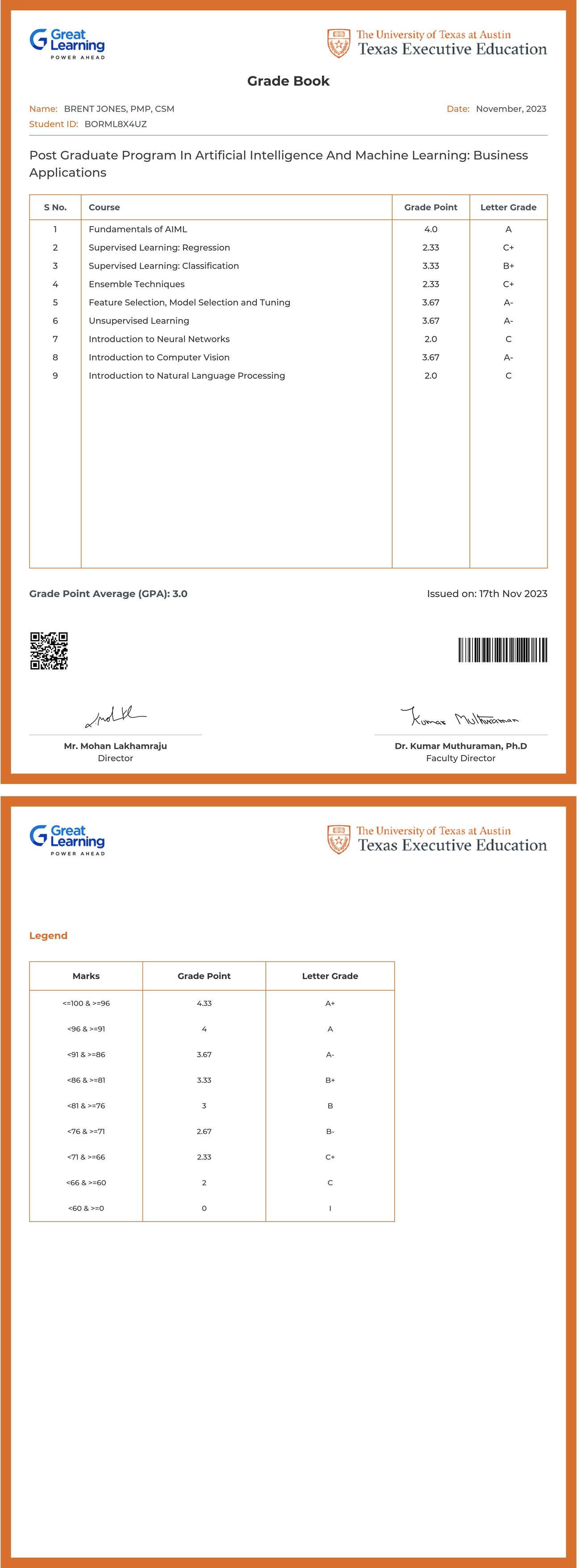 The grade sheet below verifies that BRENT JONES, PMP, CSM has completed the POST GRADUATE PROGRAM IN ARTIFICIAL INTELLIGENCE AND MACHINE LEARNING: BUSINESS APPLICATIONS