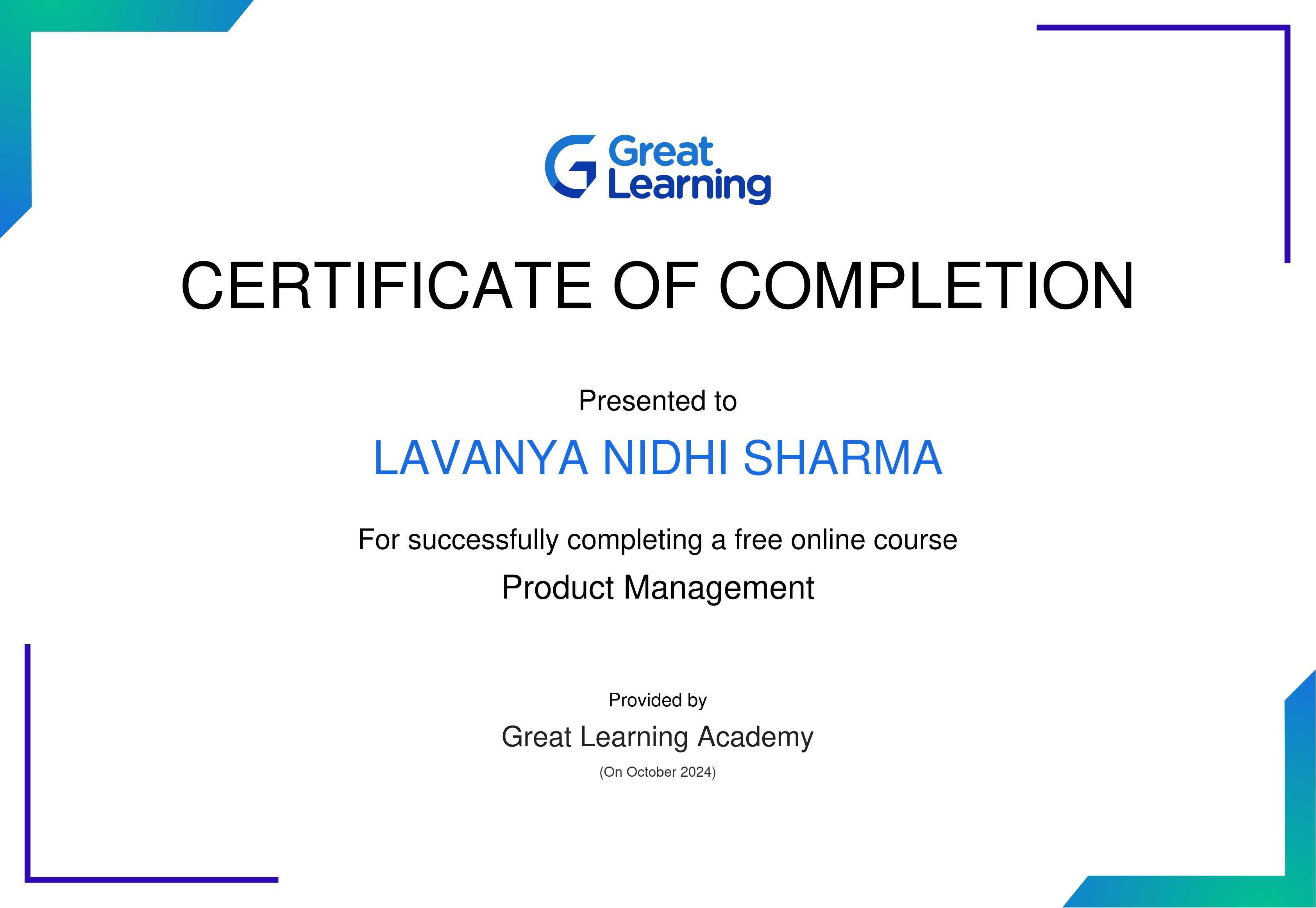 The certificate above verifies that Lavanya Nidhi Sharma has successfully completed the course Product Management
