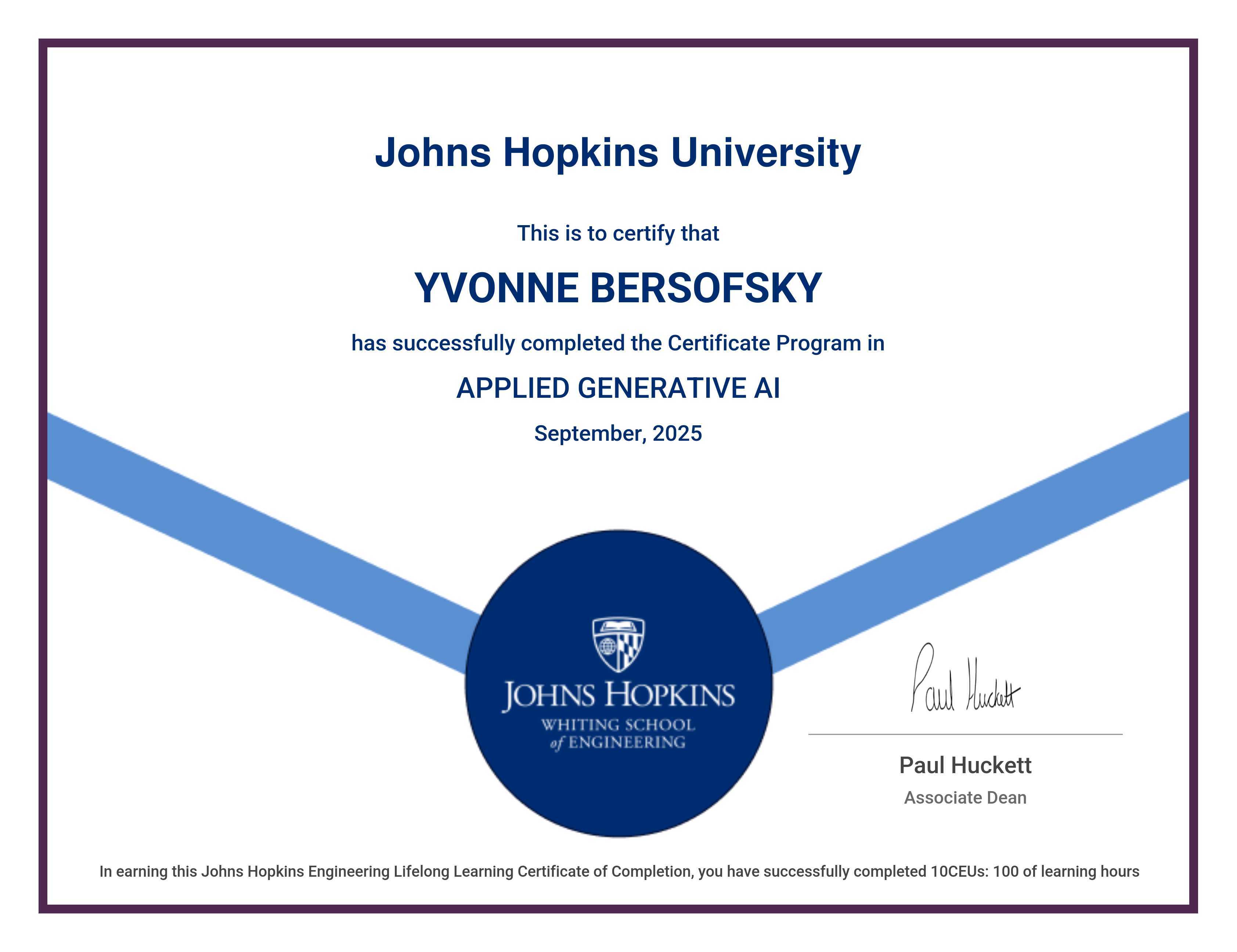 The certificate below verifies that YVONNE BERSOFSKY has completed the APPLIED GENERATIVE AI