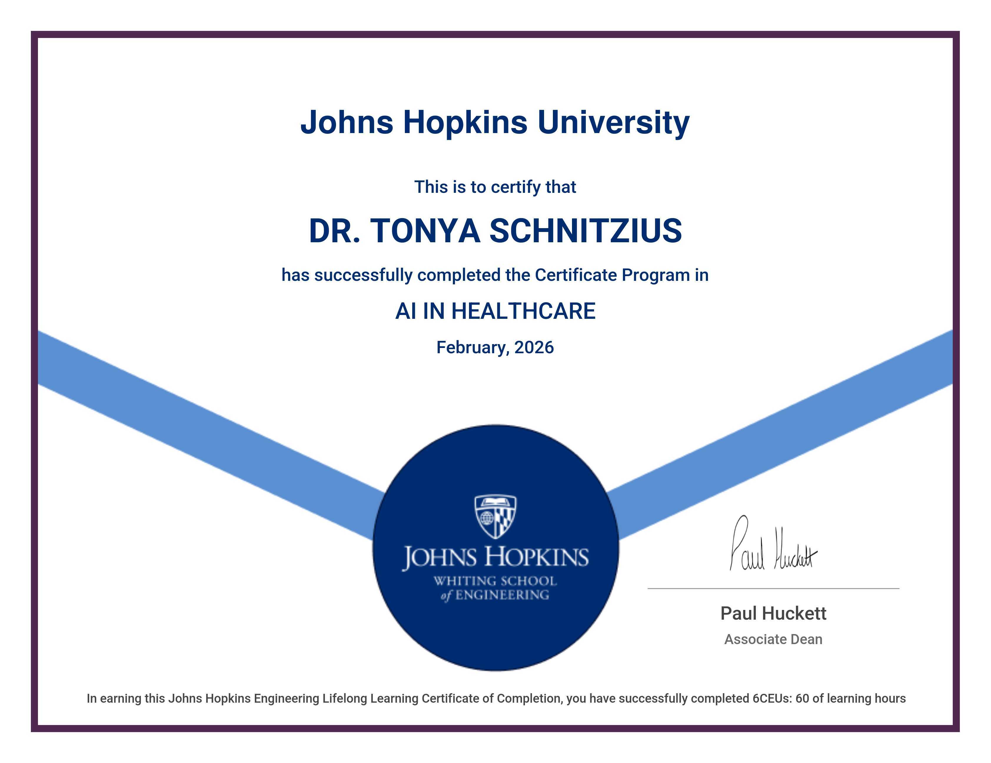 The certificate below verifies that DR. TONYA SCHNITZIUS has completed the AI IN HEALTHCARE