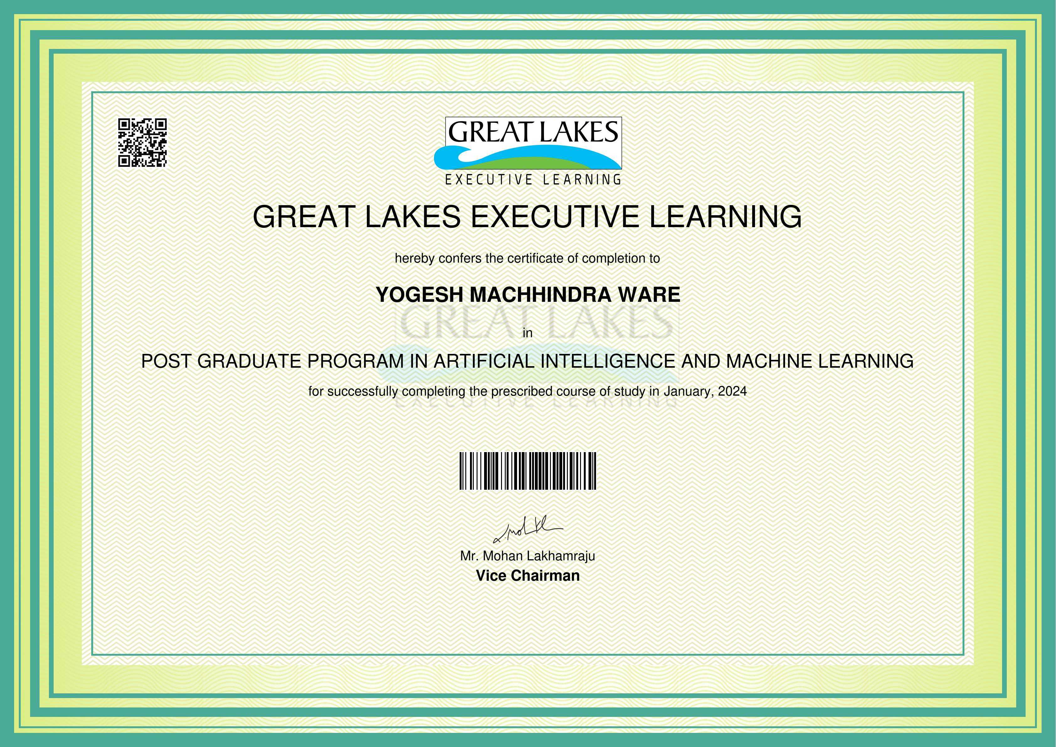 The certificate below verifies that YOGESH MACHHINDRA WARE has completed the POST GRADUATE PROGRAM IN ARTIFICIAL INTELLIGENCE AND MACHINE LEARNING