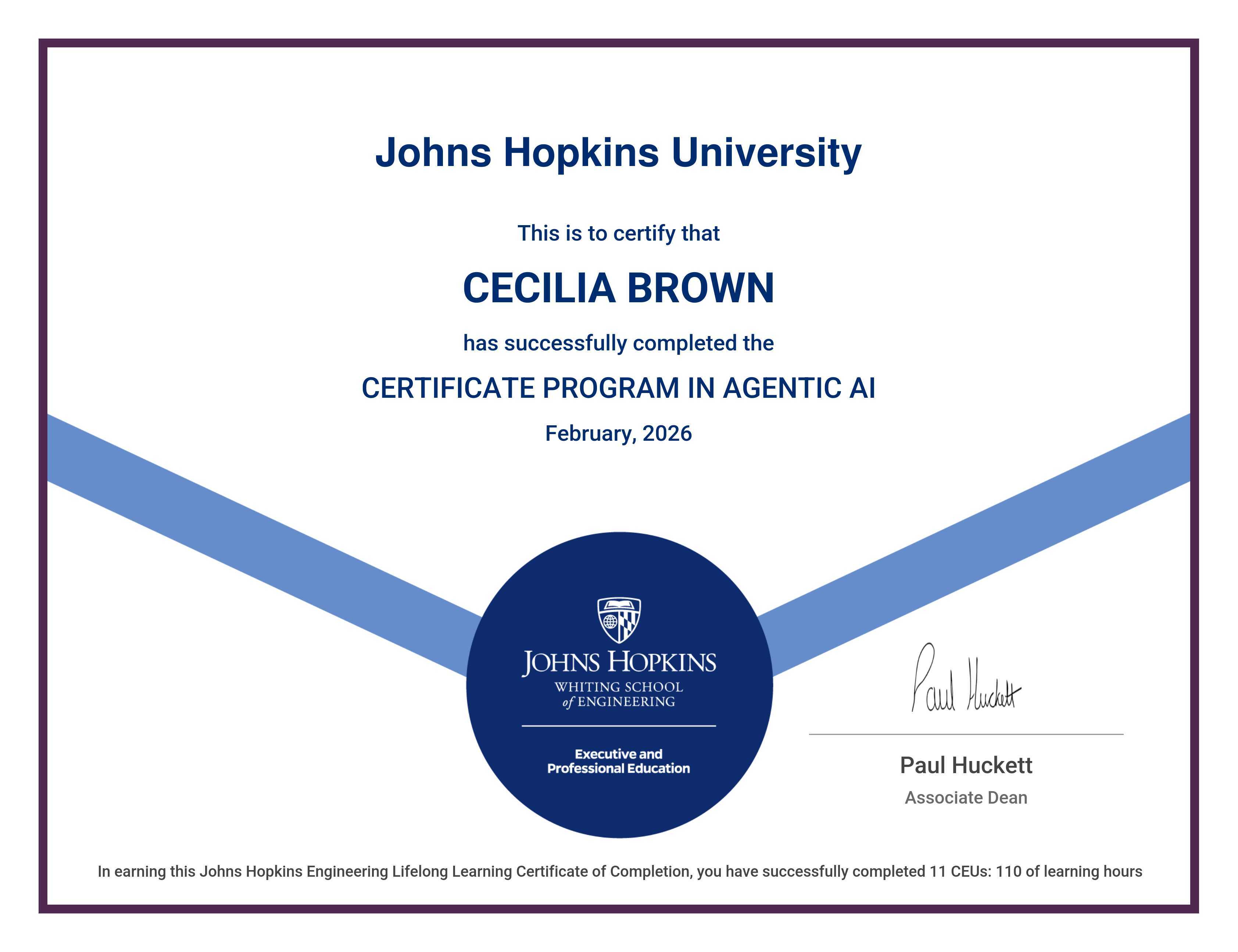 The certificate below verifies that CECILIA BROWN has completed the CERTIFICATE PROGRAM IN AGENTIC AI
