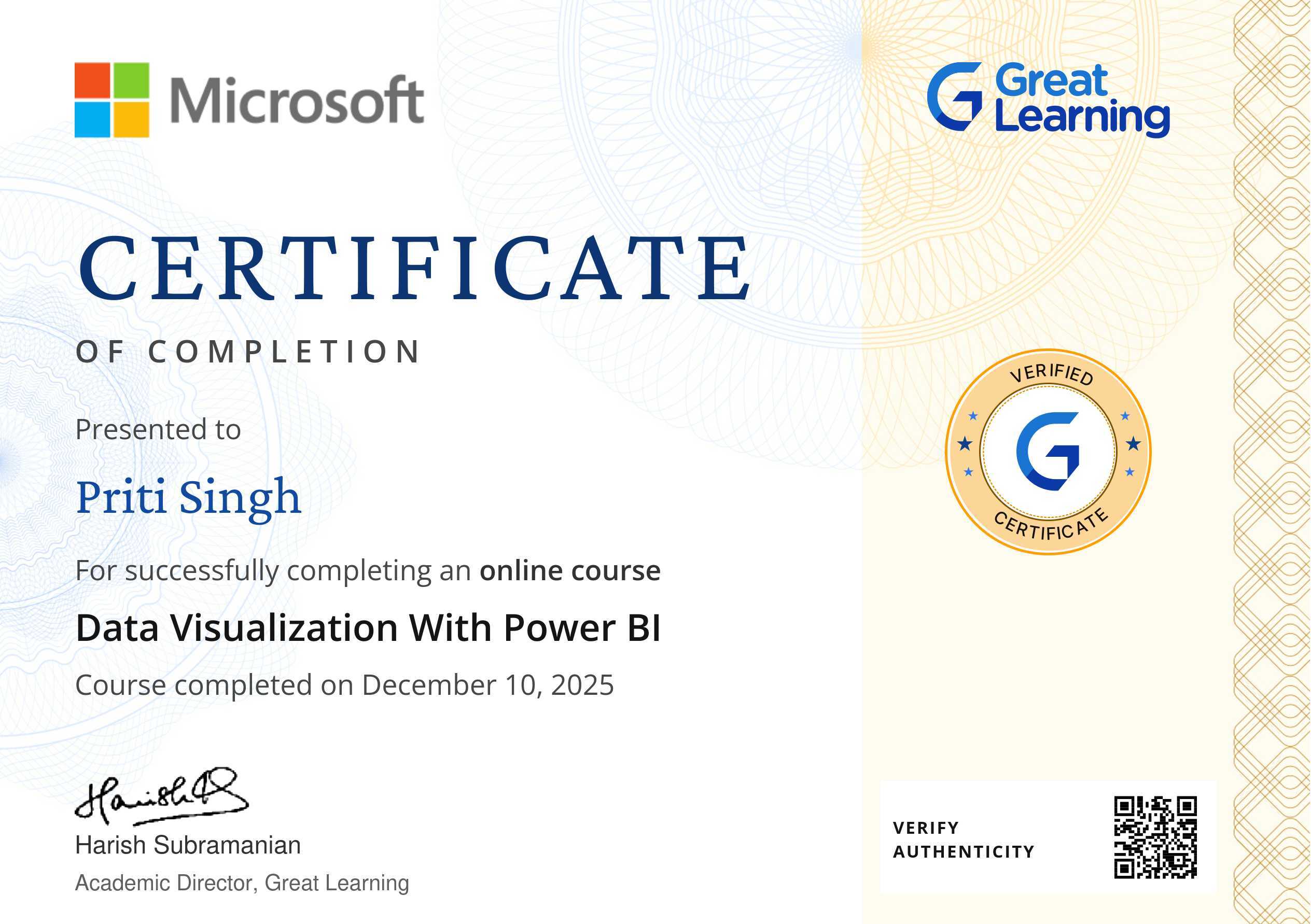 The certificate above verifies that Priti Singh has successfully completed the course Data Visualization With Power BI