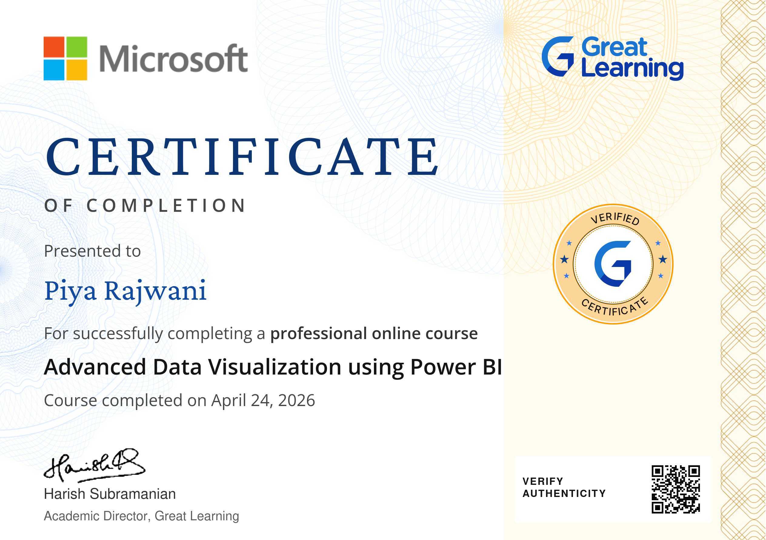 The certificate above verifies that Piya Rajwani has successfully completed the course Advanced Data Visualization using Power BI