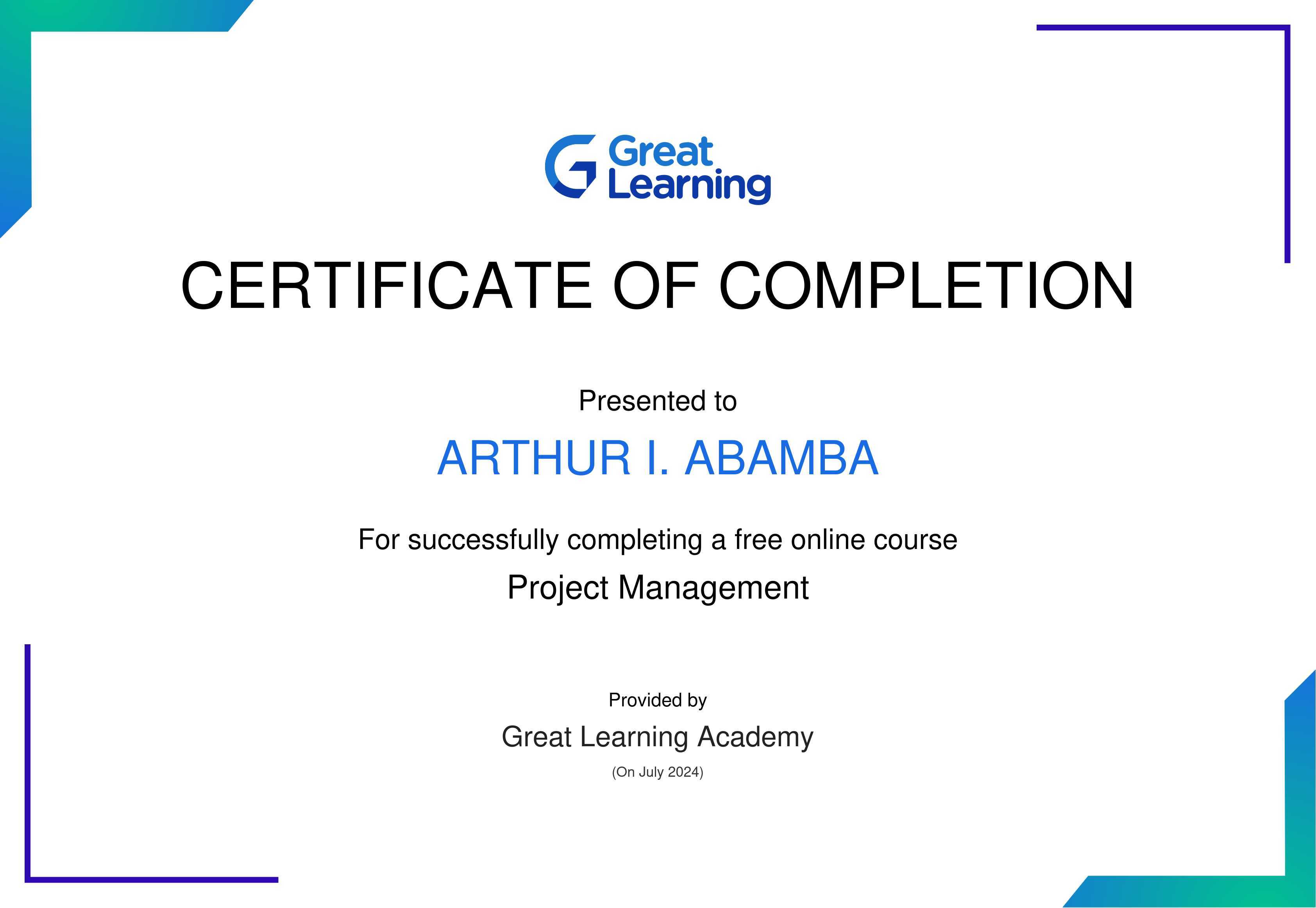 The certificate above verifies that Arthur I. Abamba has successfully completed the course Project Management