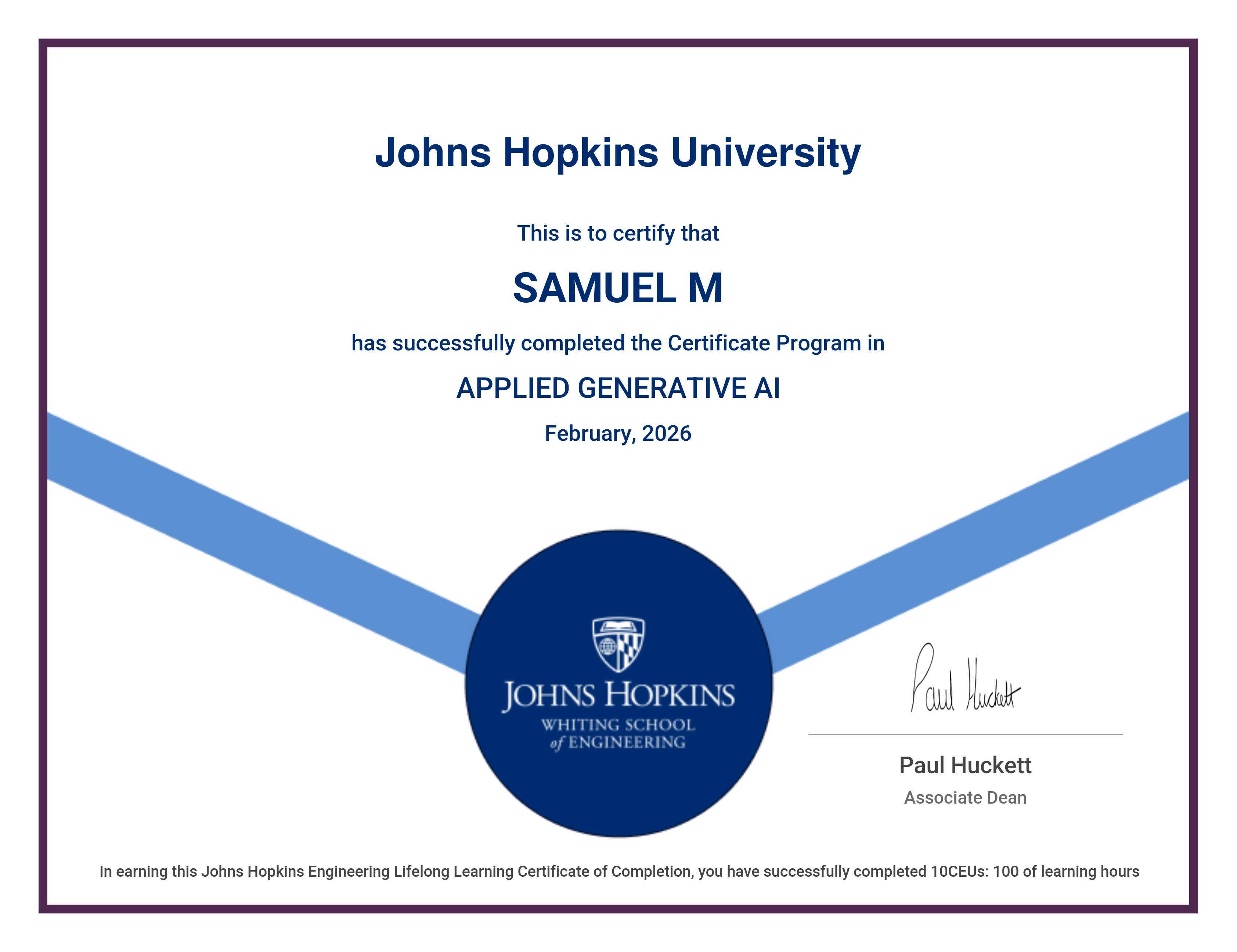 The certificate below verifies that SAMUEL M has completed the APPLIED GENERATIVE AI