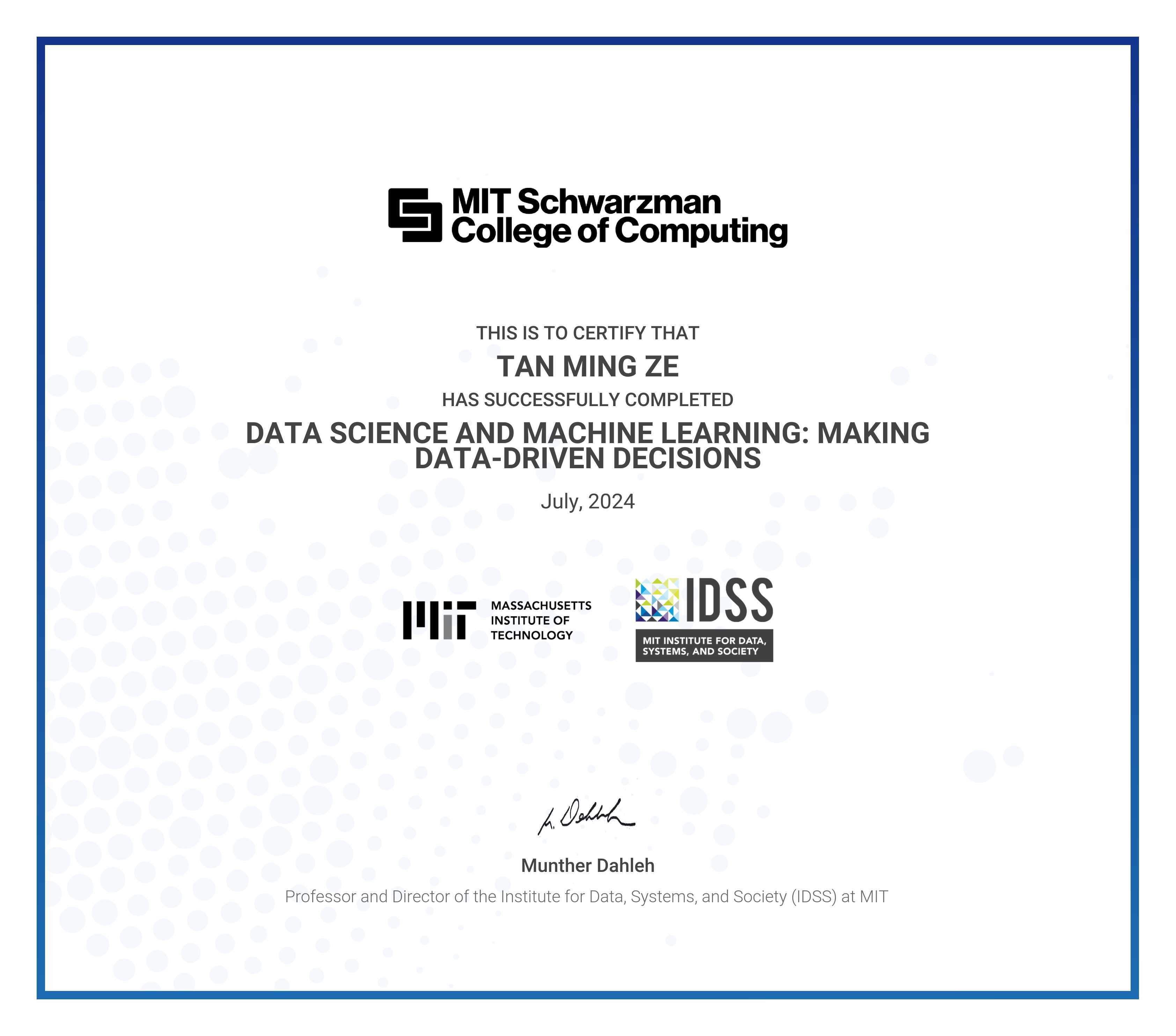 The certificate below verifies that TAN MING ZE has completed the DATA SCIENCE AND MACHINE LEARNING: MAKING DATA-DRIVEN DECISIONS