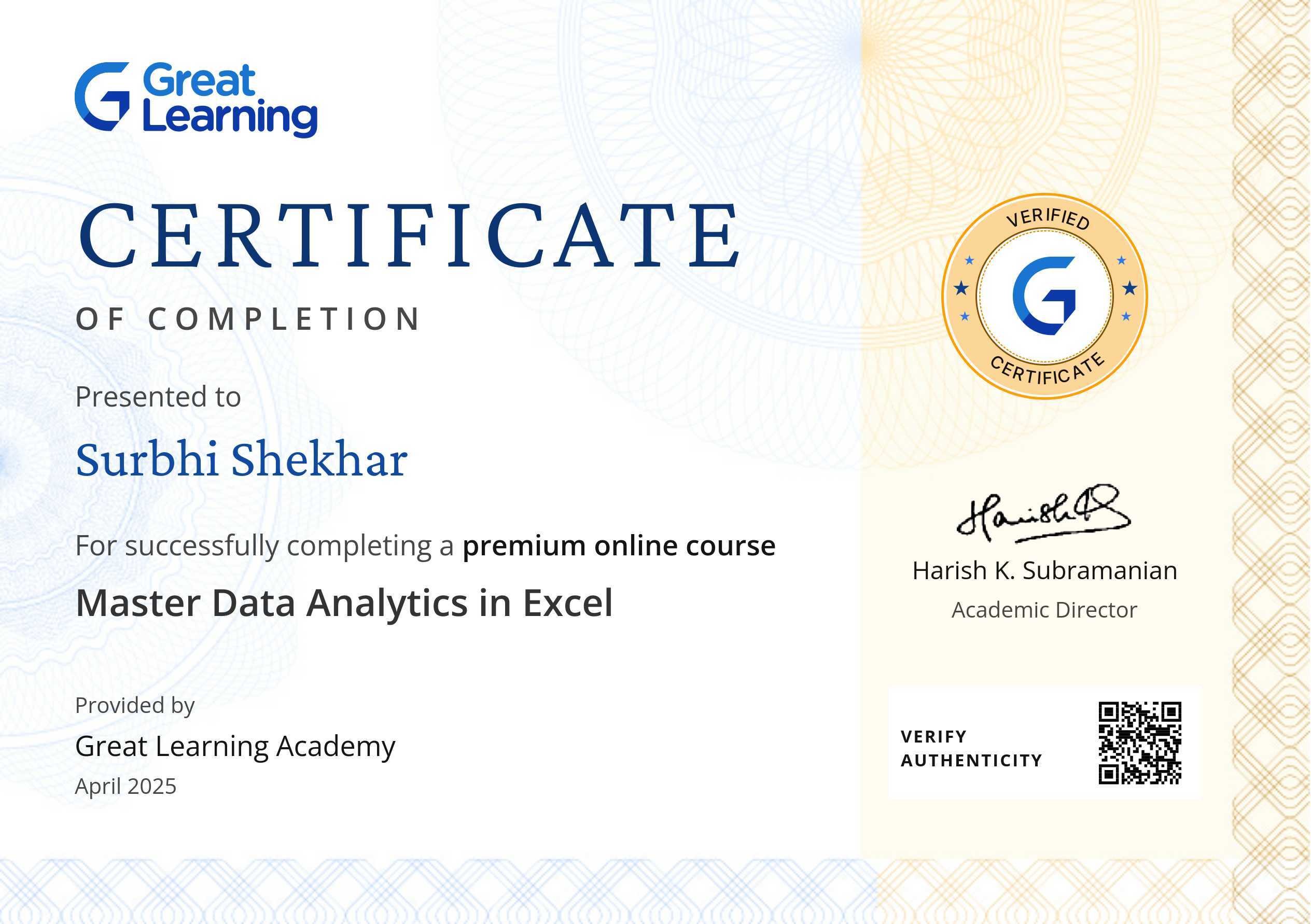 The certificate above verifies that Surbhi Shekhar has successfully completed the course Master Data Analytics in Excel