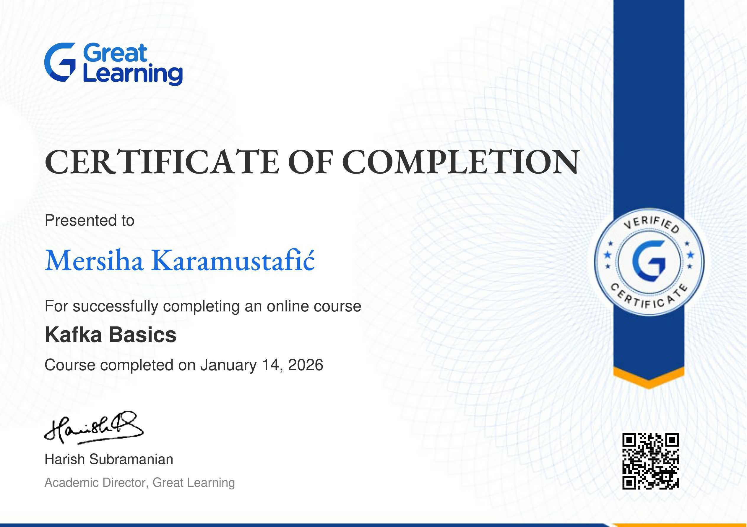 The certificate above verifies that Mersiha Karamustafić has successfully completed the course Kafka Basics