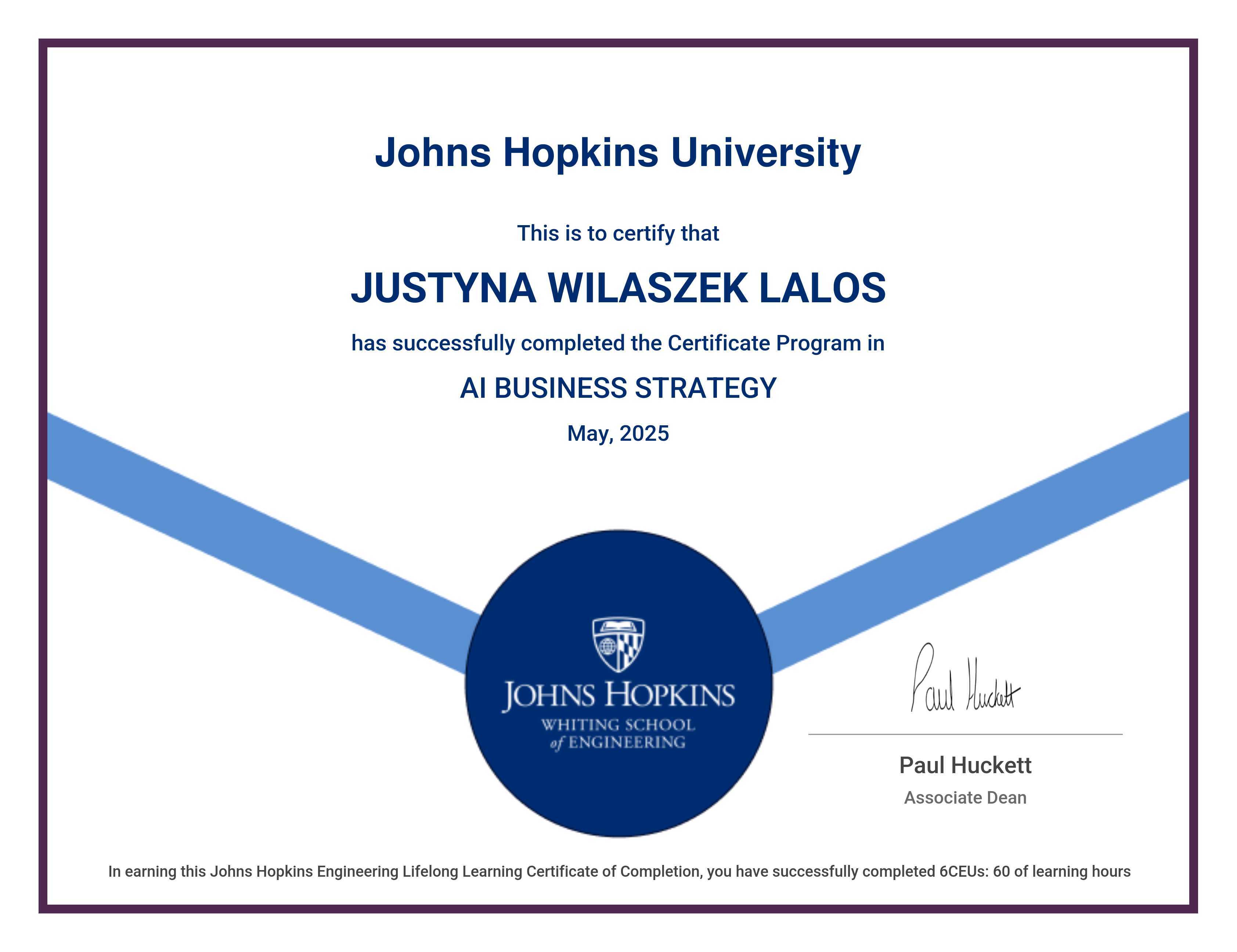 The certificate below verifies that JUSTYNA WILASZEK LALOS has completed the AI BUSINESS STRATEGY