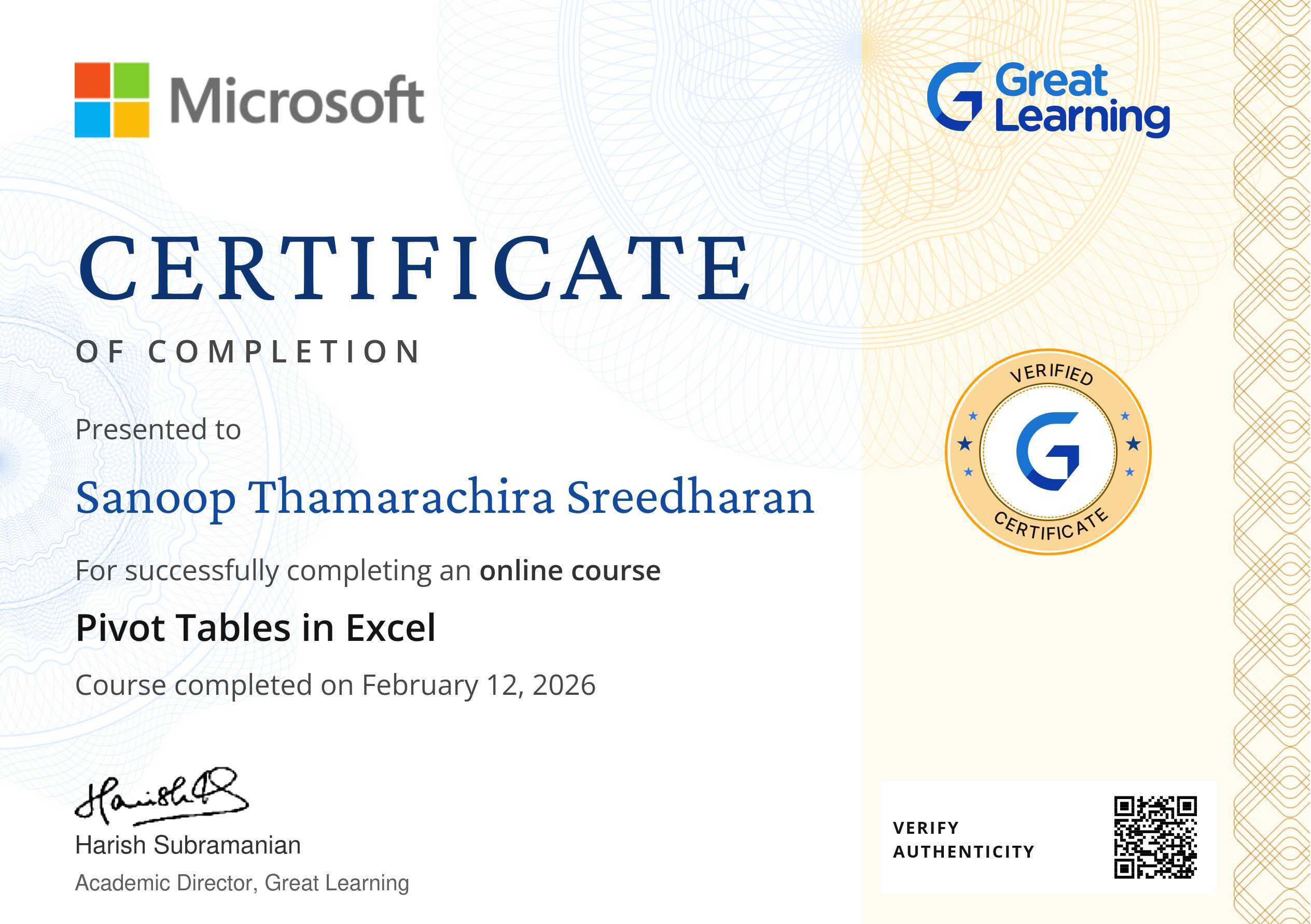 The certificate above verifies that Sanoop Thamarachira Sreedharan has successfully completed the course Pivot Tables in Excel
