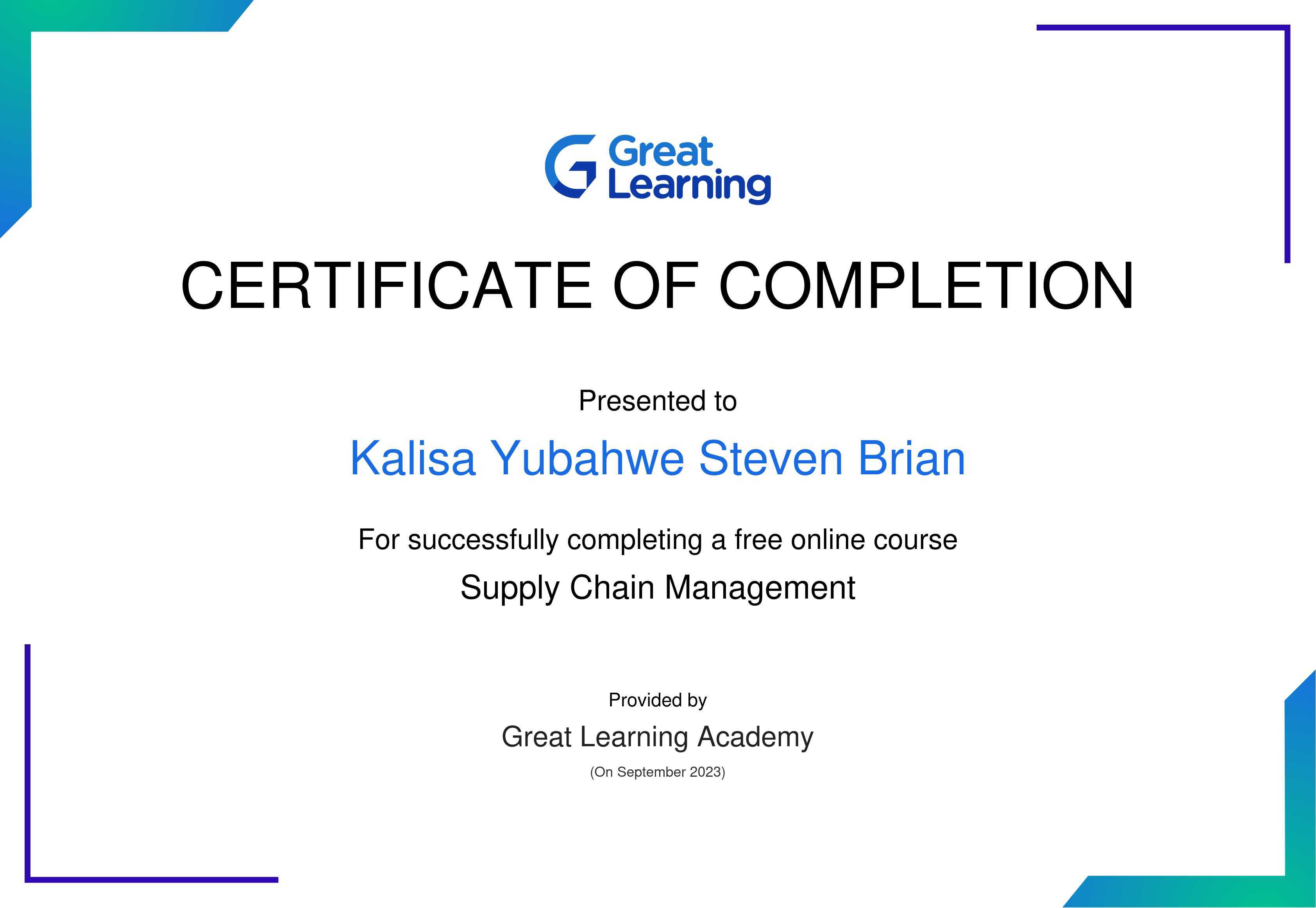 The certificate above verifies that Kalisa Yubahwe Steven Brian has successfully completed the course Supply Chain Management