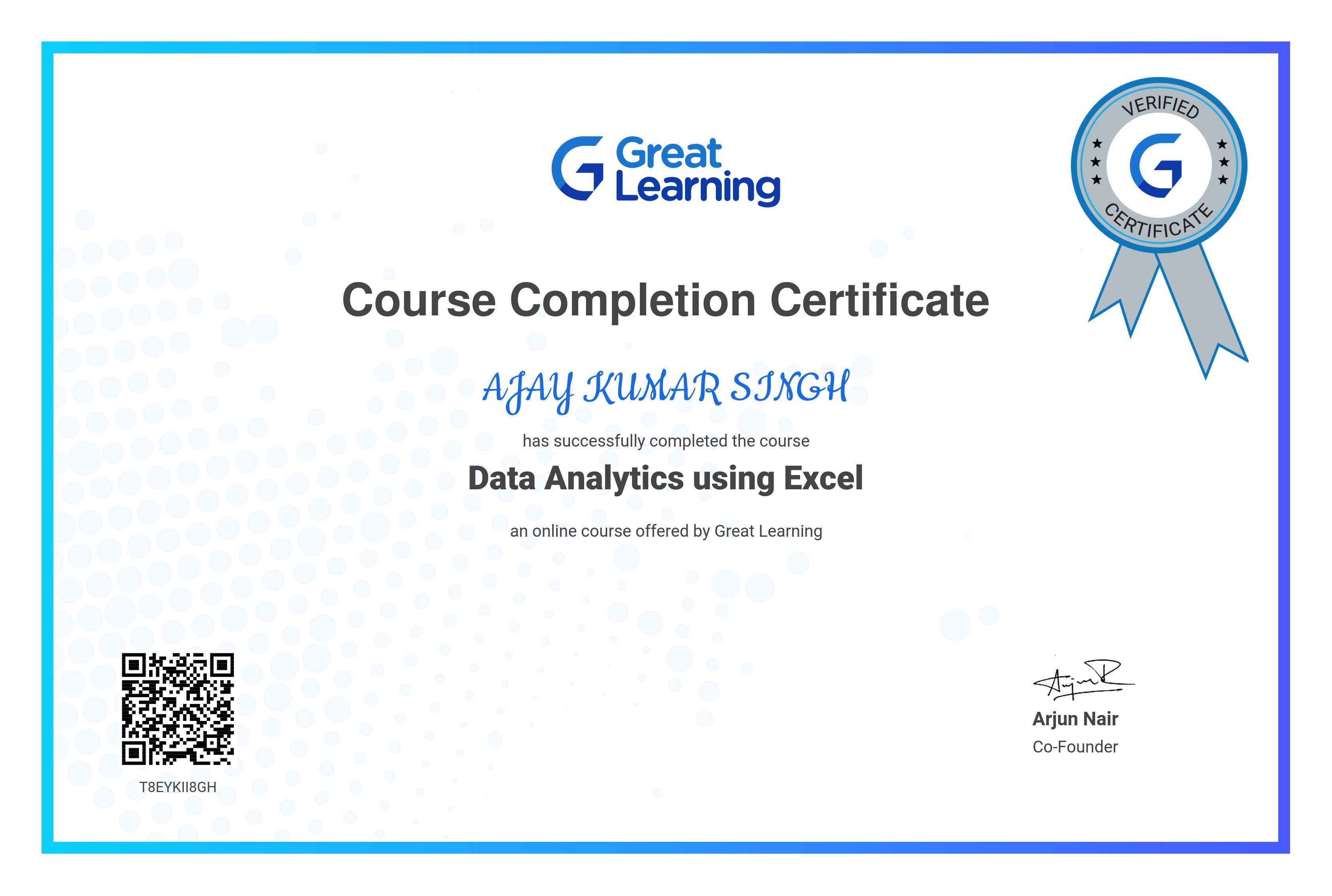 The certificate above verifies that Ajay Kumar Singh has successfully completed the course Data Analytics using Excel