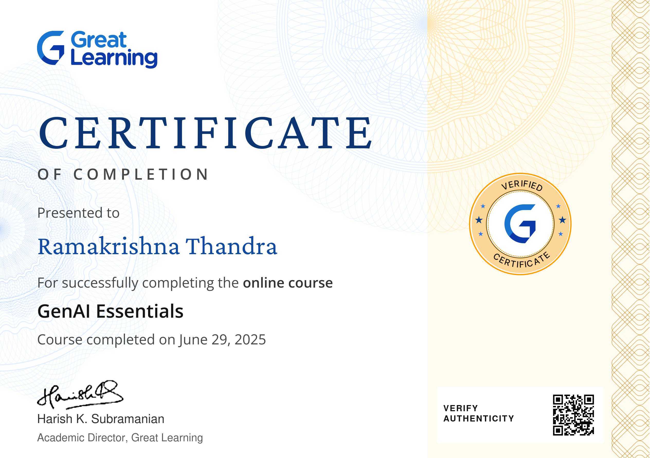 The certificate above verifies that Ramakrishna Thandra has successfully completed the course GenAI Essentials