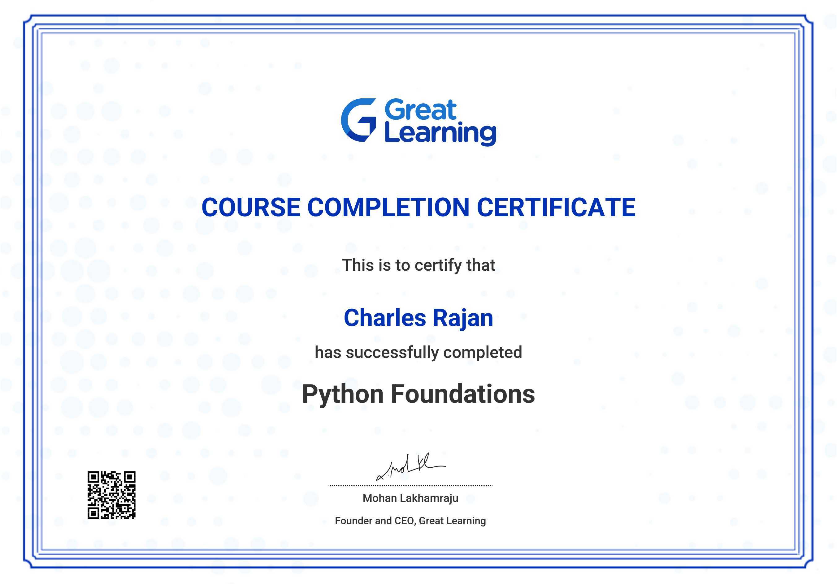 The certificate below verifies that Charles Rajan has completed the Python Foundations course