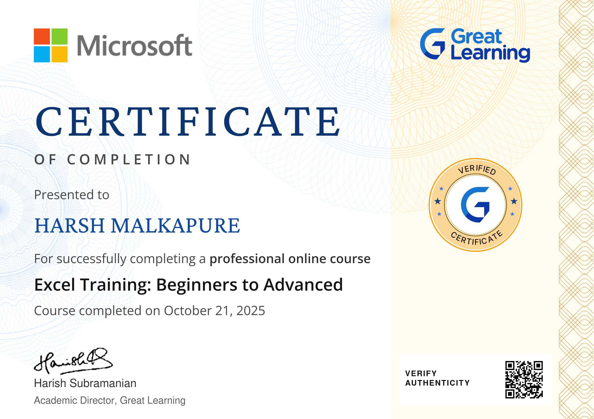The certificate above verifies that Harsh Malkapure has successfully completed the course Excel Training: Beginners to Advanced