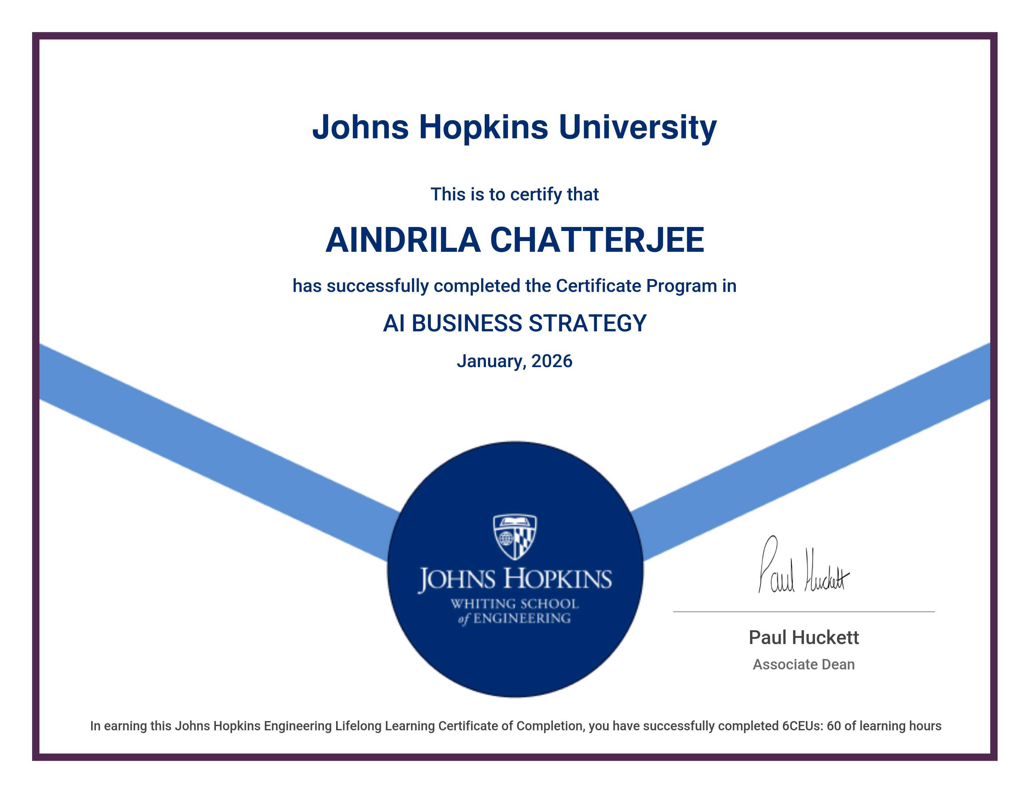The certificate below verifies that AINDRILA CHATTERJEE has completed the AI BUSINESS STRATEGY