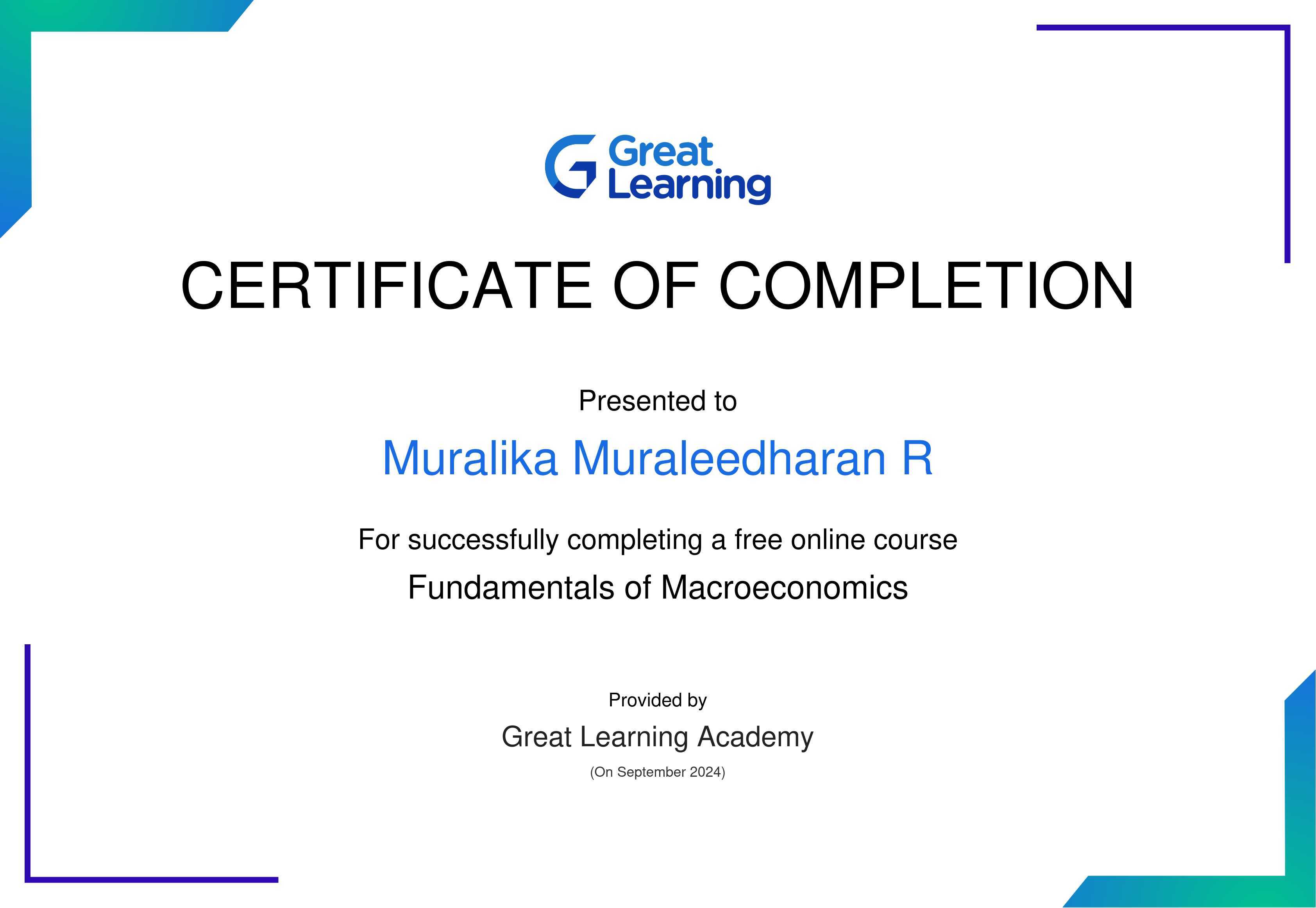 The certificate above verifies that Muralika Muraleedharan R has successfully completed the course Fundamentals of Macroeconomics