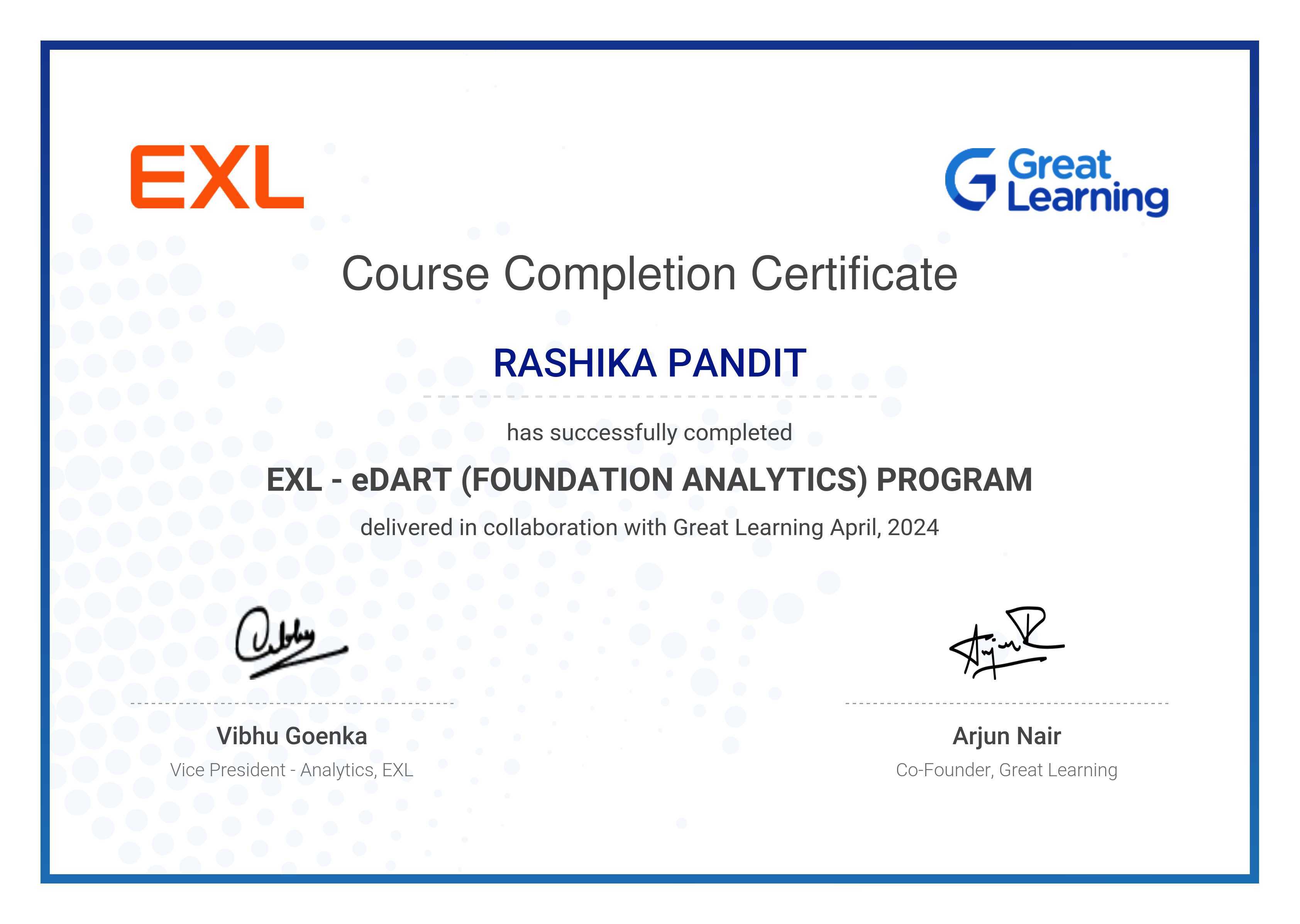 The certificate below verifies that RASHIKA PANDIT has completed the EXL - eDART (Foundation Analytics) Program