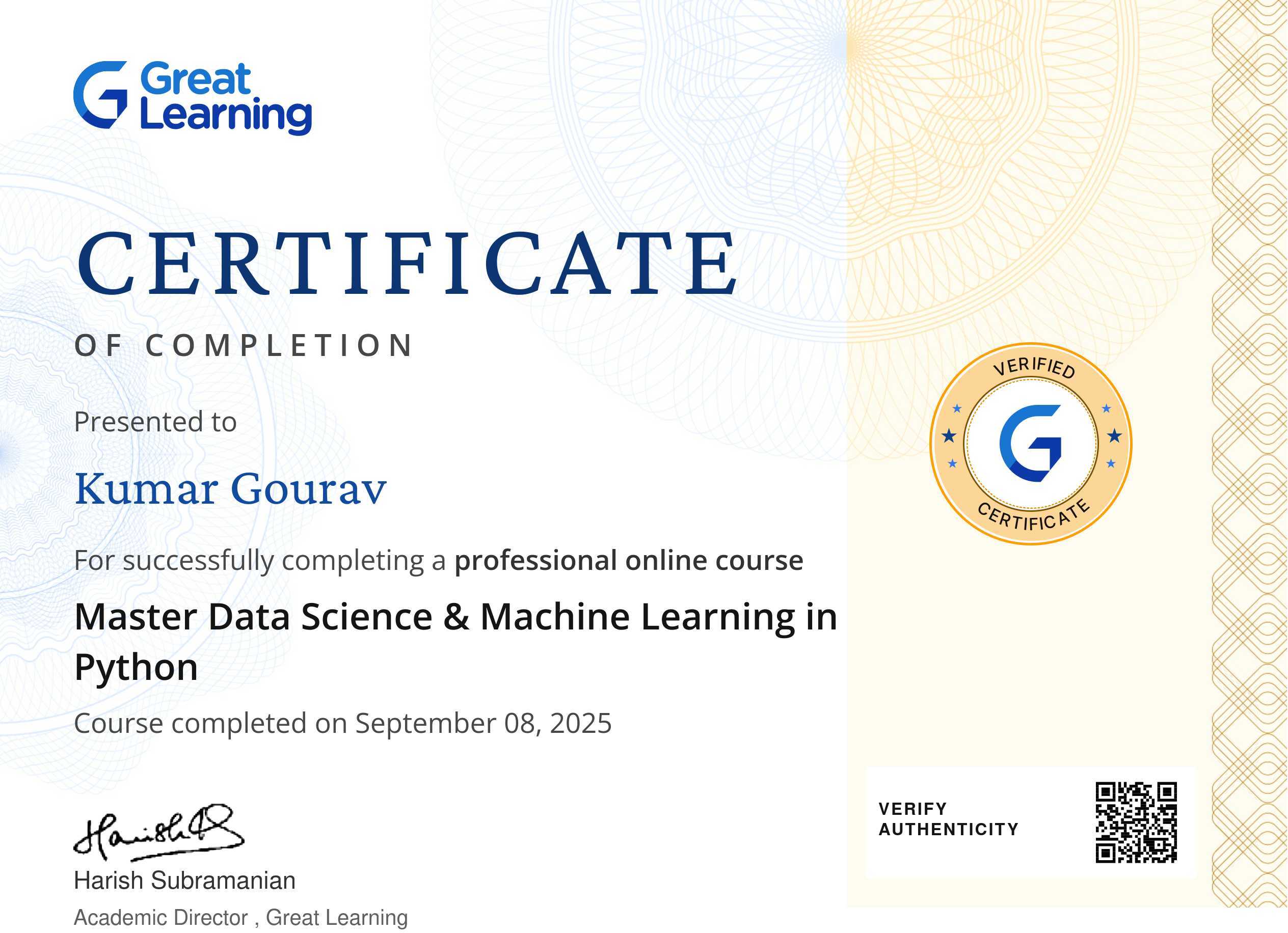 The certificate above verifies that Kumar Gourav has successfully completed the course Master Data Science & Machine Learning in Python