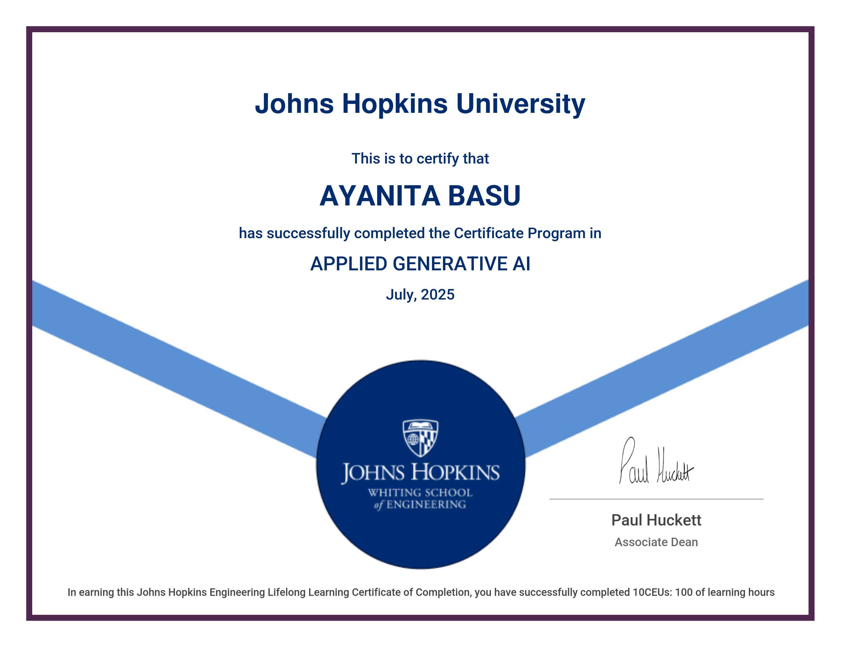 The certificate below verifies that AYANITA BASU has completed the APPLIED GENERATIVE AI