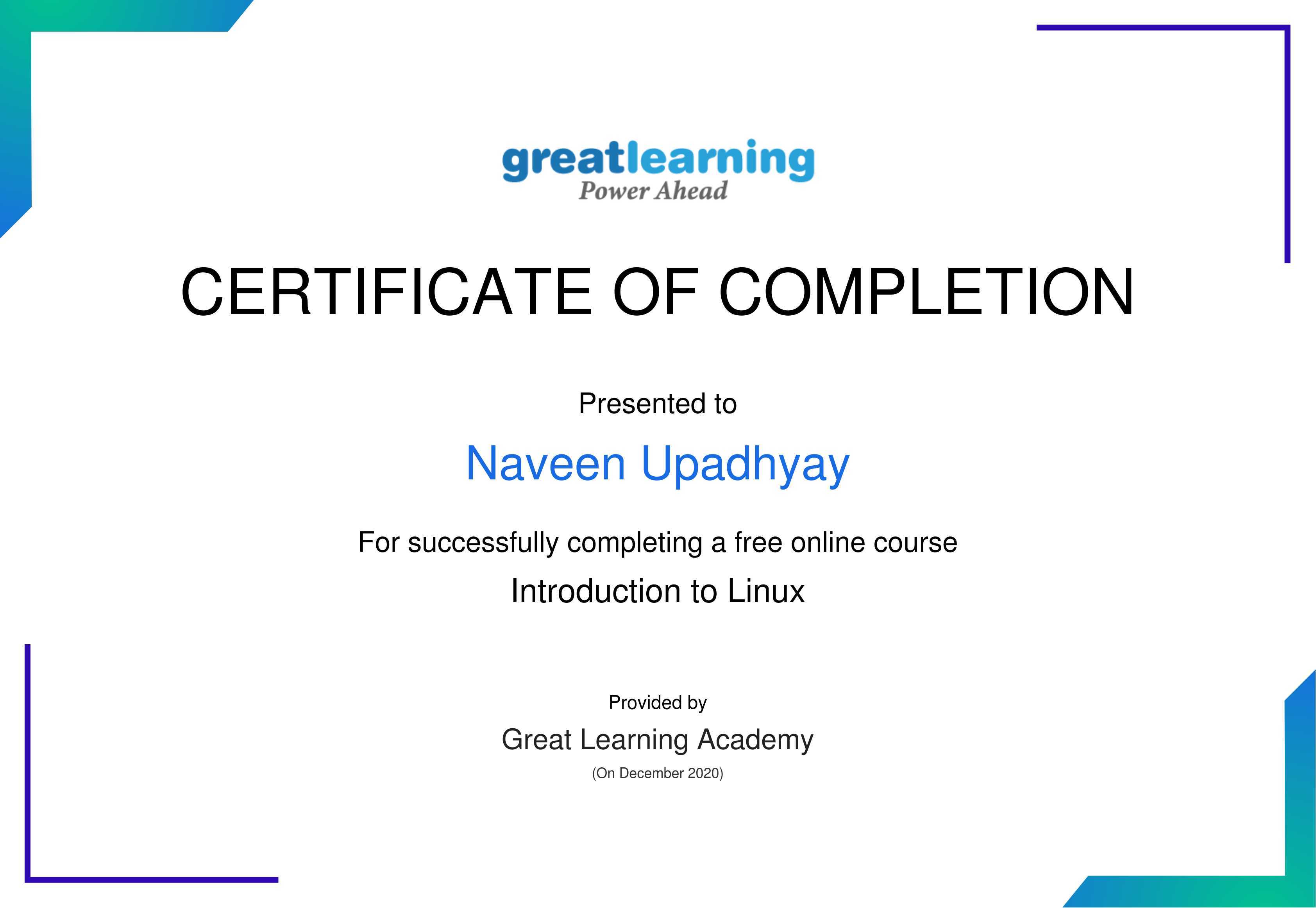 The certificate above verifies that Naveen Upadhyay has successfully completed the course Linux in Hindi