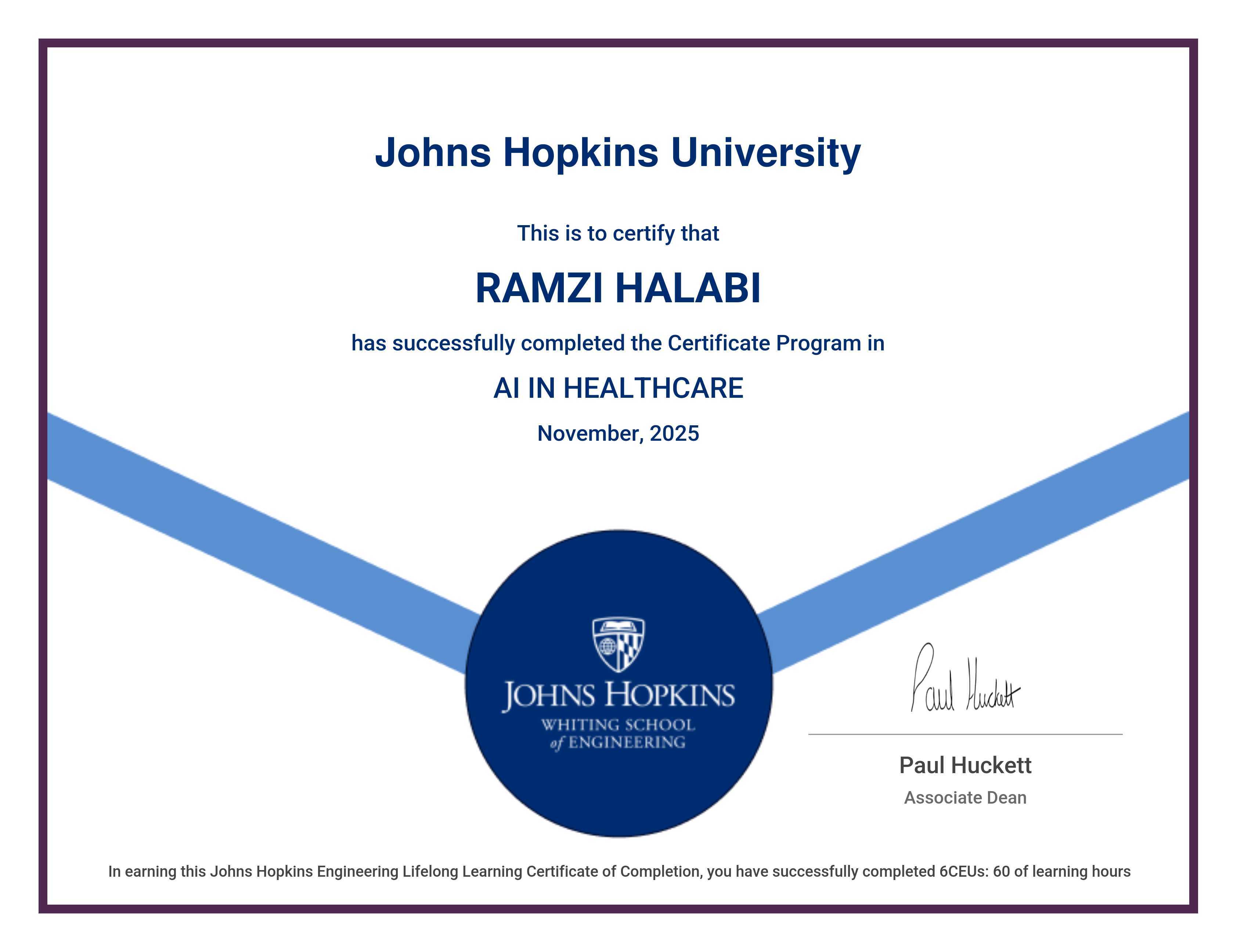 The certificate below verifies that RAMZI HALABI has completed the AI IN HEALTHCARE