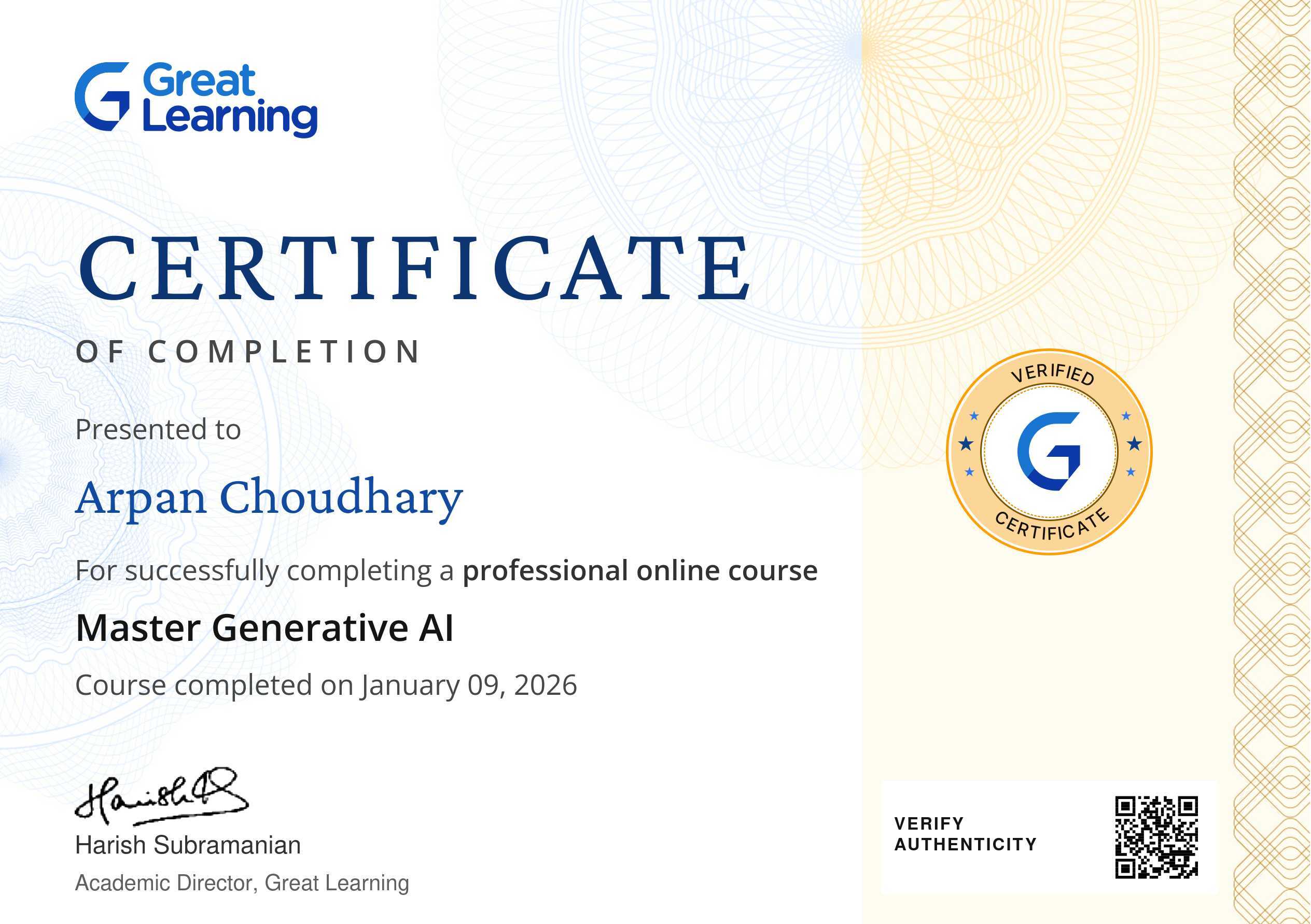 The certificate above verifies that Arpan Choudhary has successfully completed the course Master Generative AI