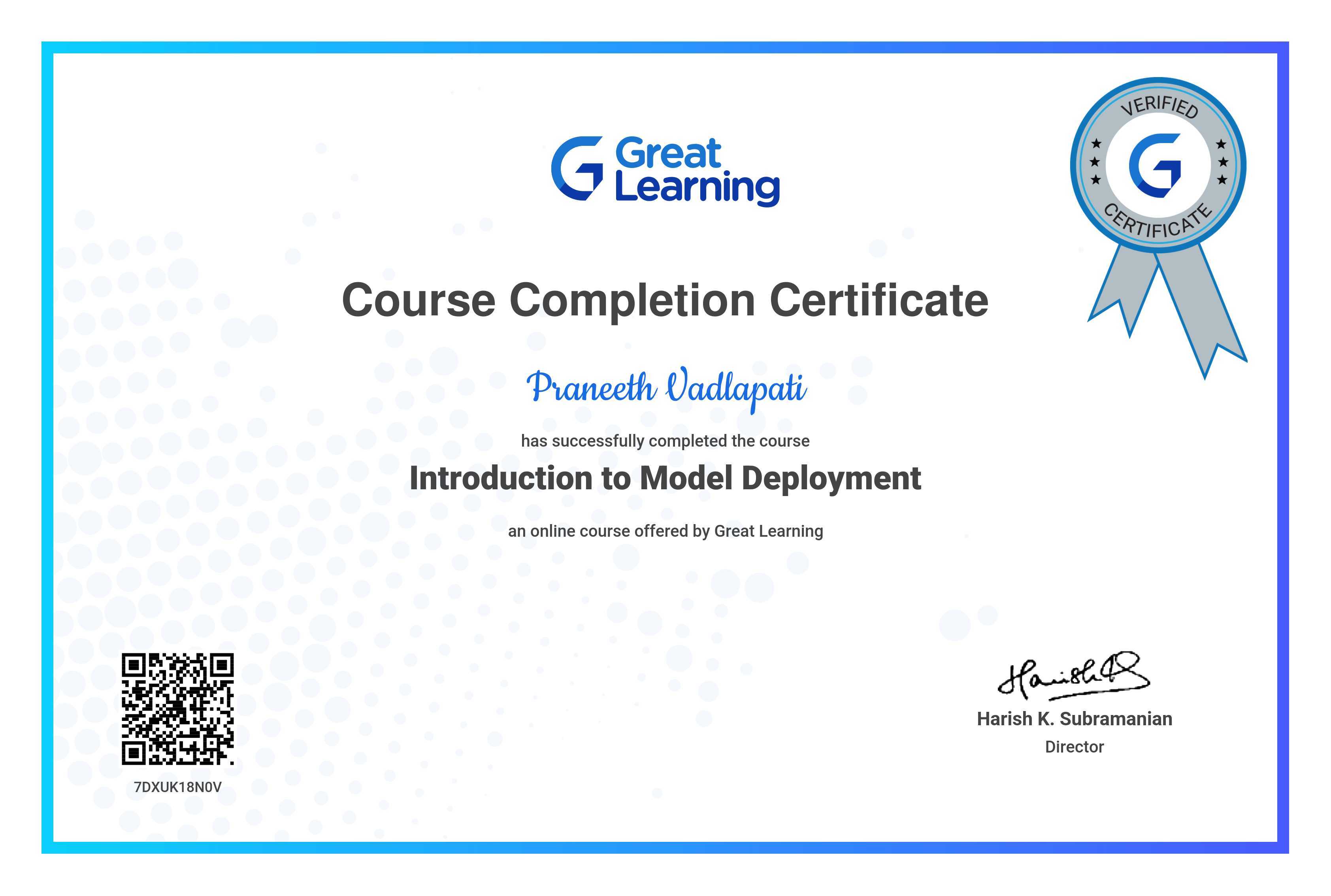 The certificate above verifies that Praneeth Vadlapati has successfully completed the course Introduction to Model Deployment