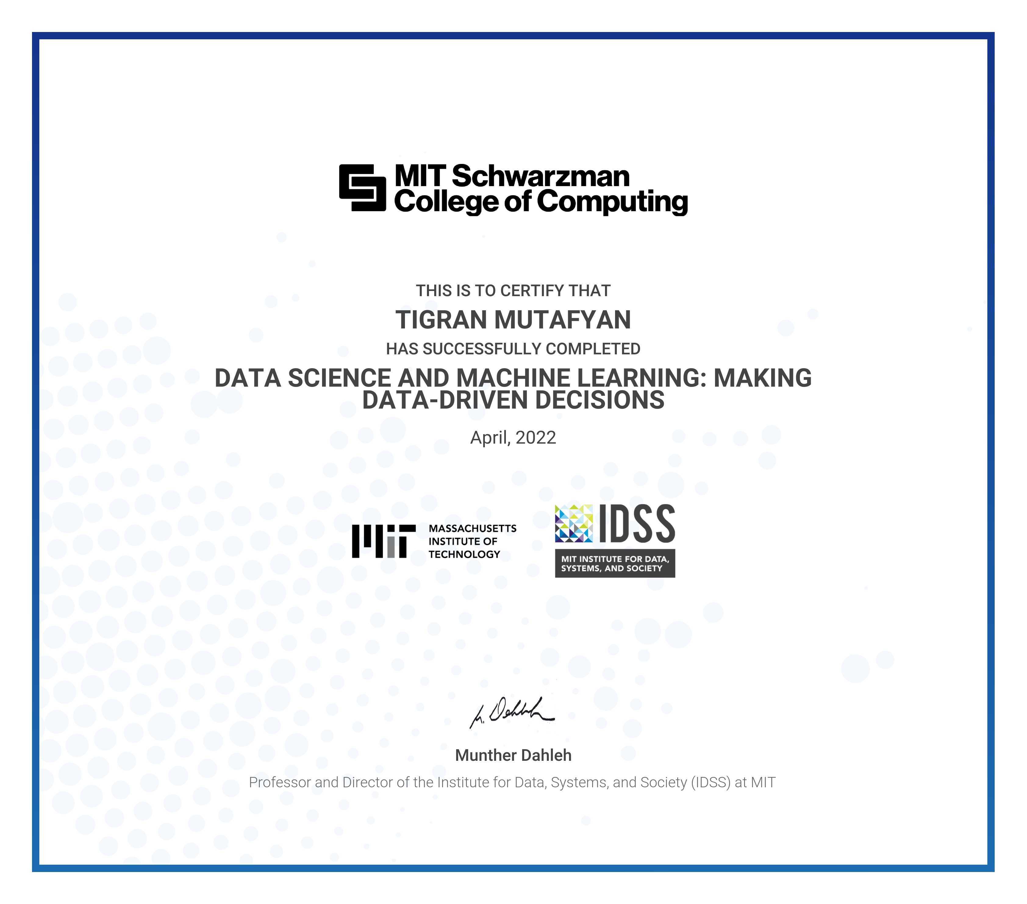 The certificate below verifies that TIGRAN MUTAFYAN has completed the DATA SCIENCE AND MACHINE LEARNING: MAKING DATA-DRIVEN DECISIONS