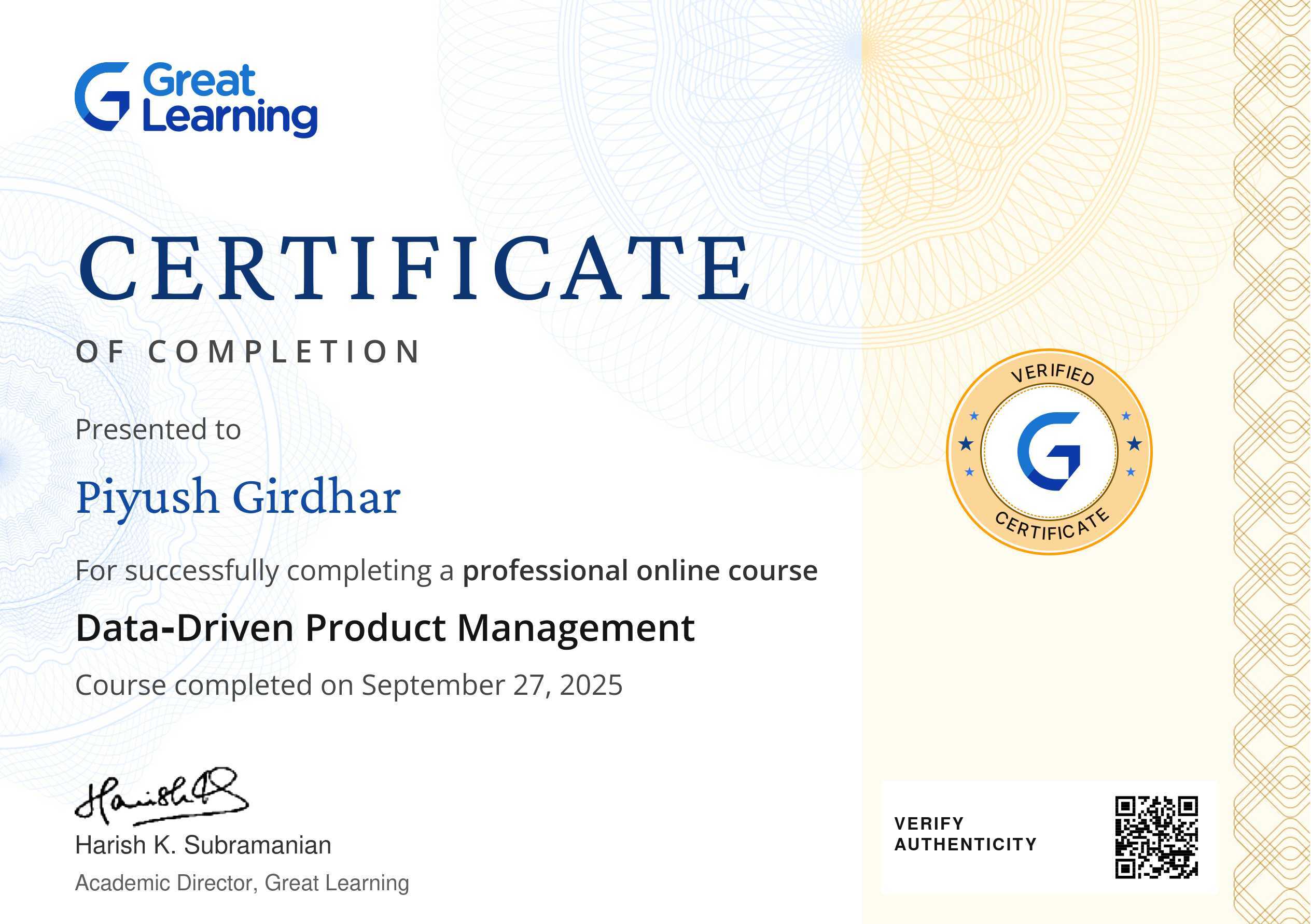 The certificate above verifies that Piyush Girdhar has successfully completed the course Data‑Driven Product Management