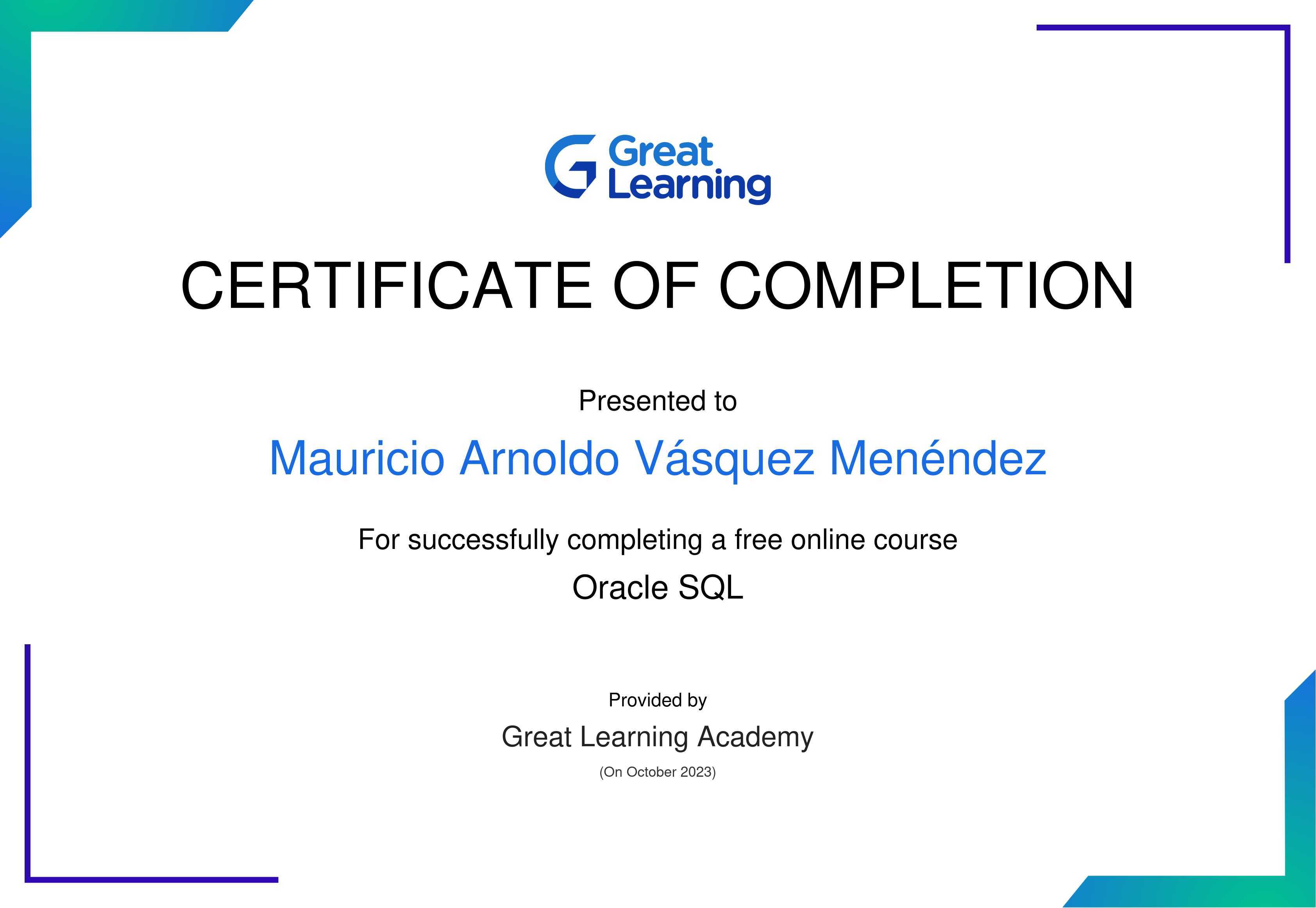 The certificate above verifies that Mauricio Arnoldo Vásquez Menéndez has successfully completed the course Oracle SQL